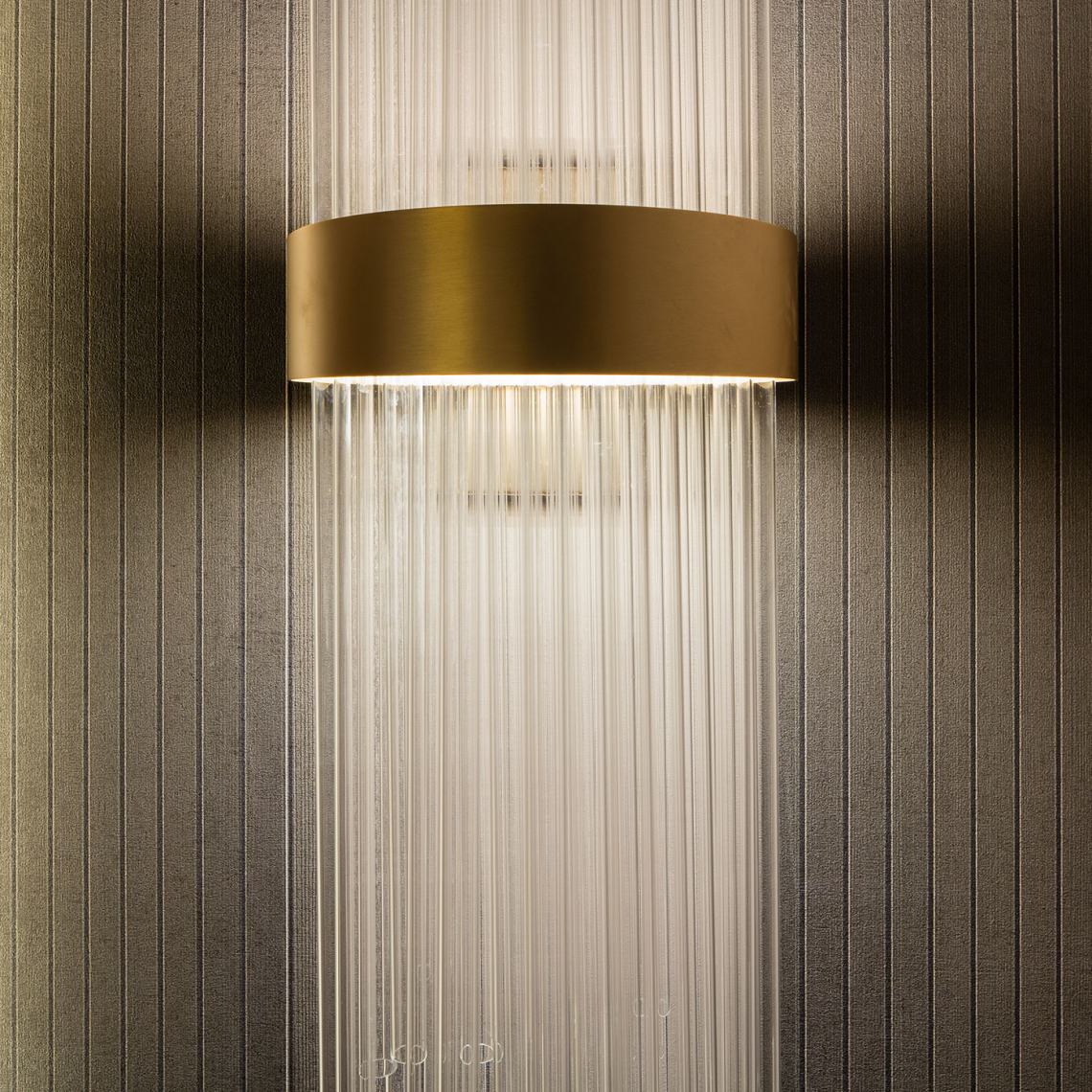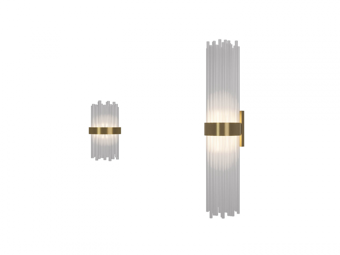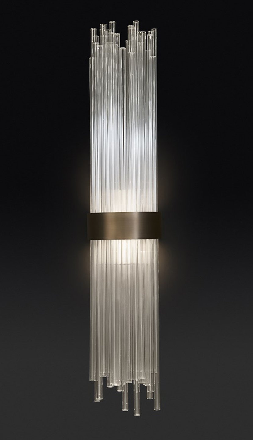 Si compone di un raffinato bouquet di tubi realizzati in vetro borosilicato veneziano e raccolti in una fascia metallica con finitura oro opaco.