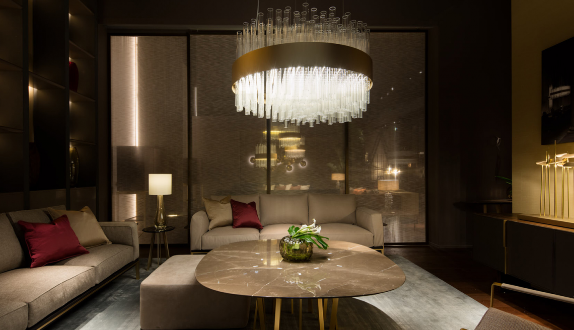 è composto da un importante bouquet di tubi realizzati in vetro borosilicato veneziano posti ad altezze sfasate e raccolti in una fascia metallica curvata, trattata con particolare finitura a più strati oro opaco. Il telaio portante interno è realizzato in metallo nichelato. Contropiastra opalescente per diffondere la luce.