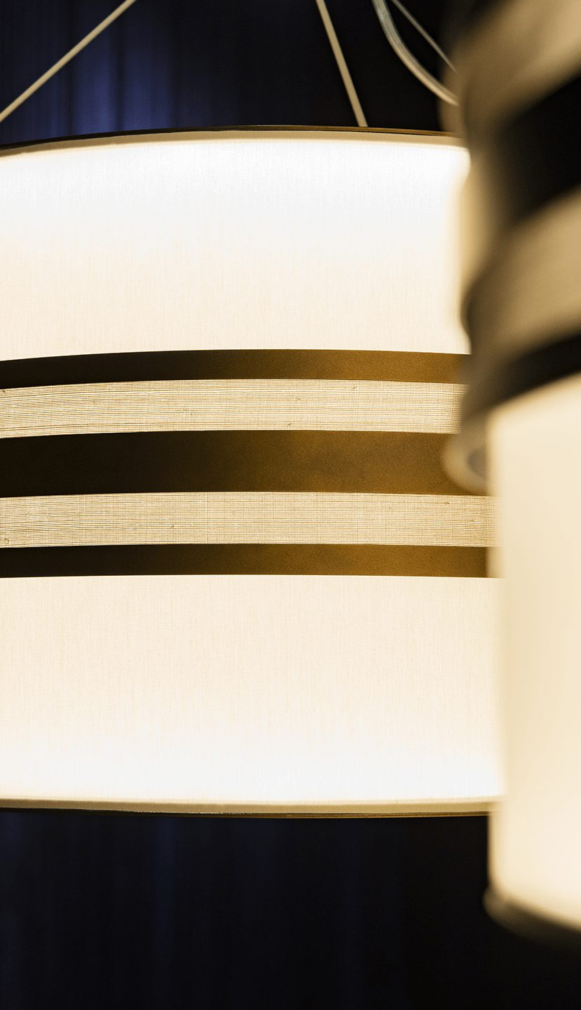 Lampada a sospensione di forma cilindrica composta da una struttura in metallo finitura bronzo con paralume interno/esterno in tessuto color avorio, al suo interno è alloggiata una moderna sorgente led. Il paralume è impreziosito esternamente da una fascia esterna rivestita con prezioso tessuto in fibra naturale di colore bronzo scuro, intrecciata manualmente.