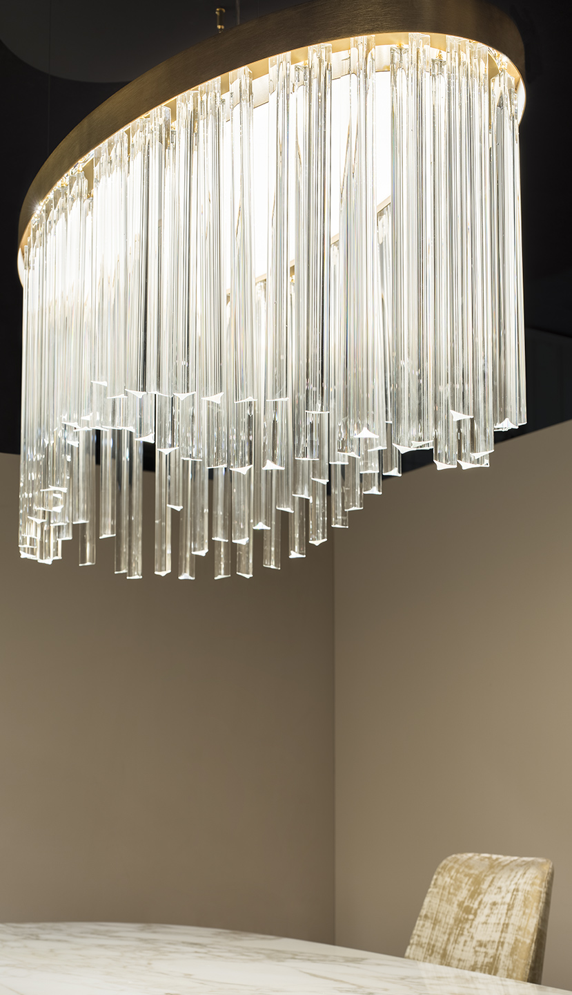 All’interno del perimetro curvi-forme è posizionata una piastra illuminante con struttura in metallo e pannello in policarbonato opalino che diffonde la luce.