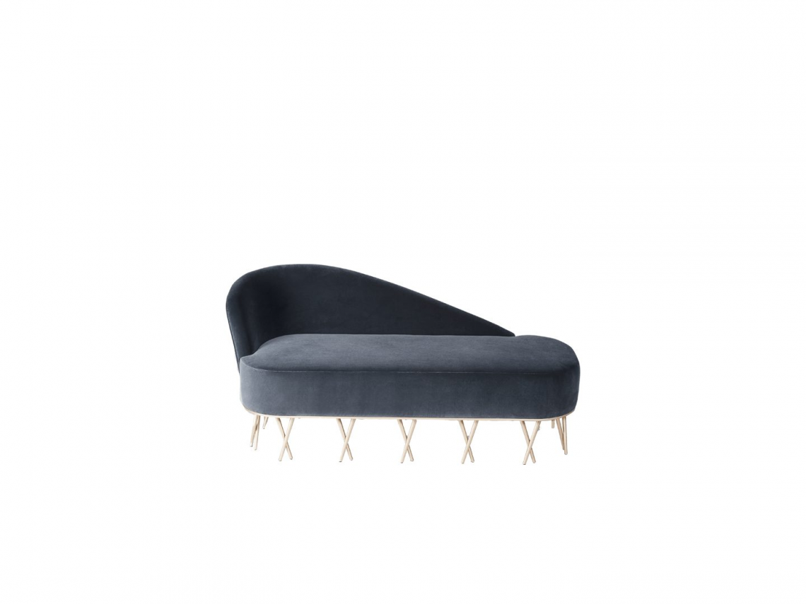 Ha un rivestimento, non sfoderabile, personalizzabile con pregiati tessuti, raffinate pelli bovine pieno fiore e nabuk. La dormeuse poggia su di una struttura in metallo con gambe disposte ad incrocio, arricchite con preziosa finitura oro opaco.