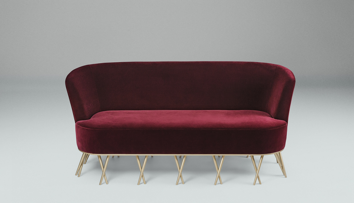 Il divano poggia su di una struttura in metallo con gambe disposte ad incrocio, arricchite con preziosa finitura oro opaco.