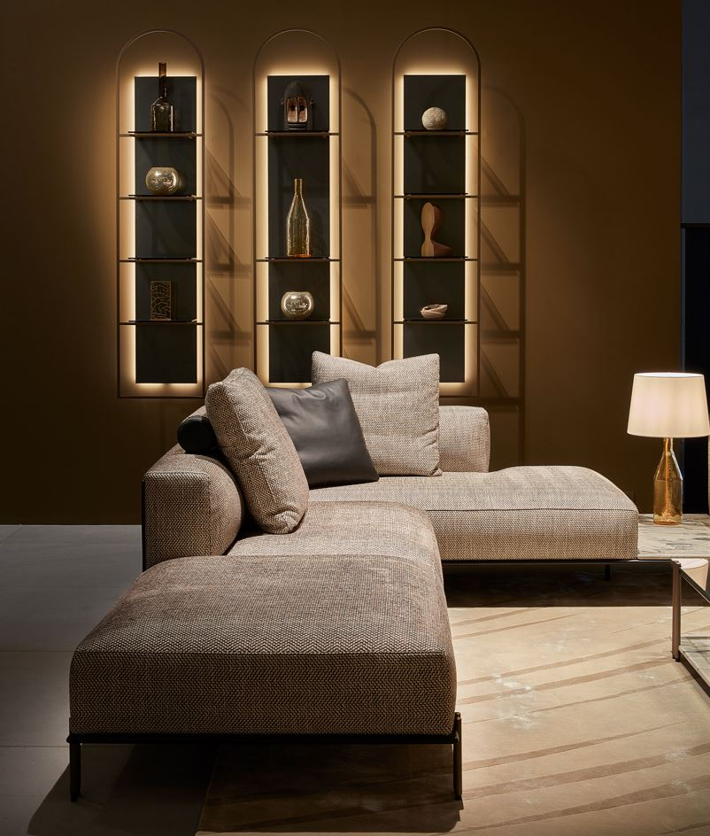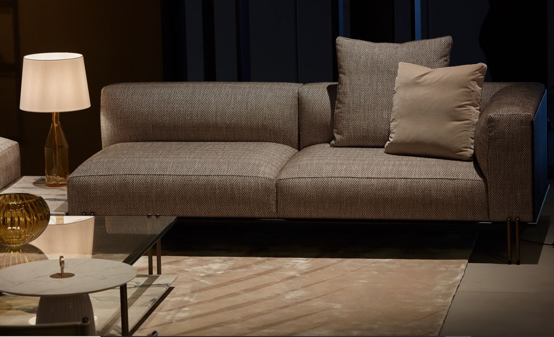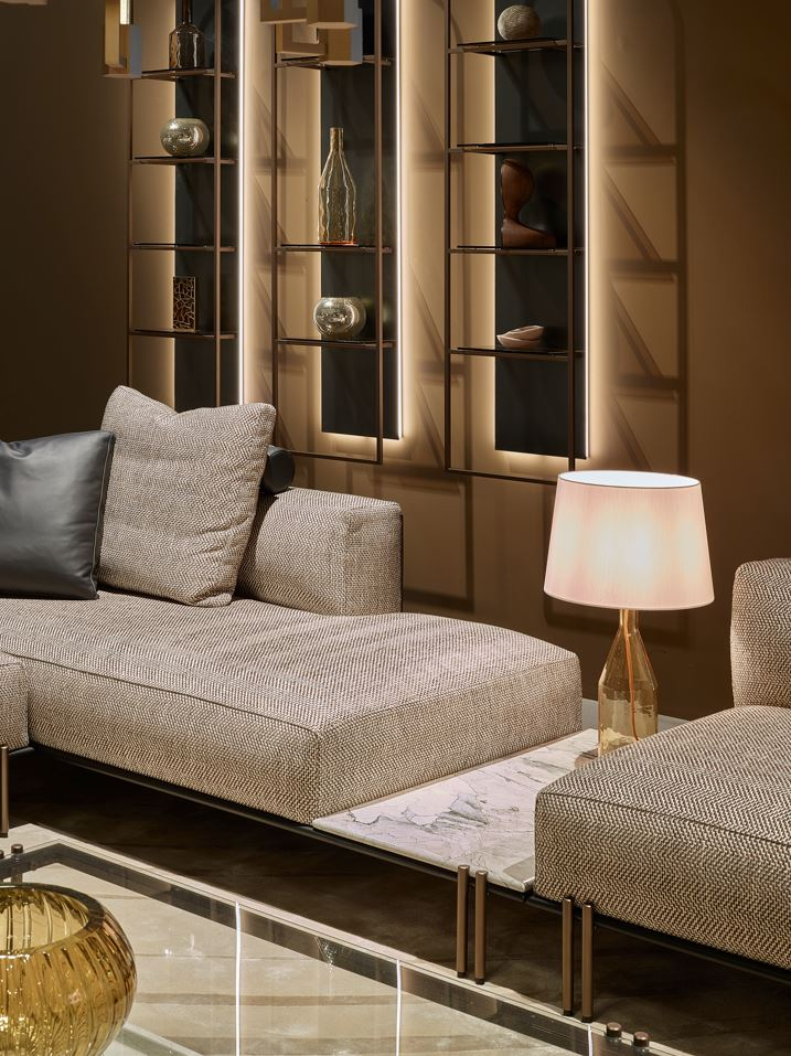 l’abbondante seduta sono il frutto di una costante ricerca nel mondo del living contemporaneo. Cuscinatura sedile e schienale non sfoderabile, realizzata in poliuretano espanso sagomato a quote differenziate. Nel modulo chaise longue con tavolino integrato il piano è realizzato in pietra Pece o in marmo Lunar Breccia.