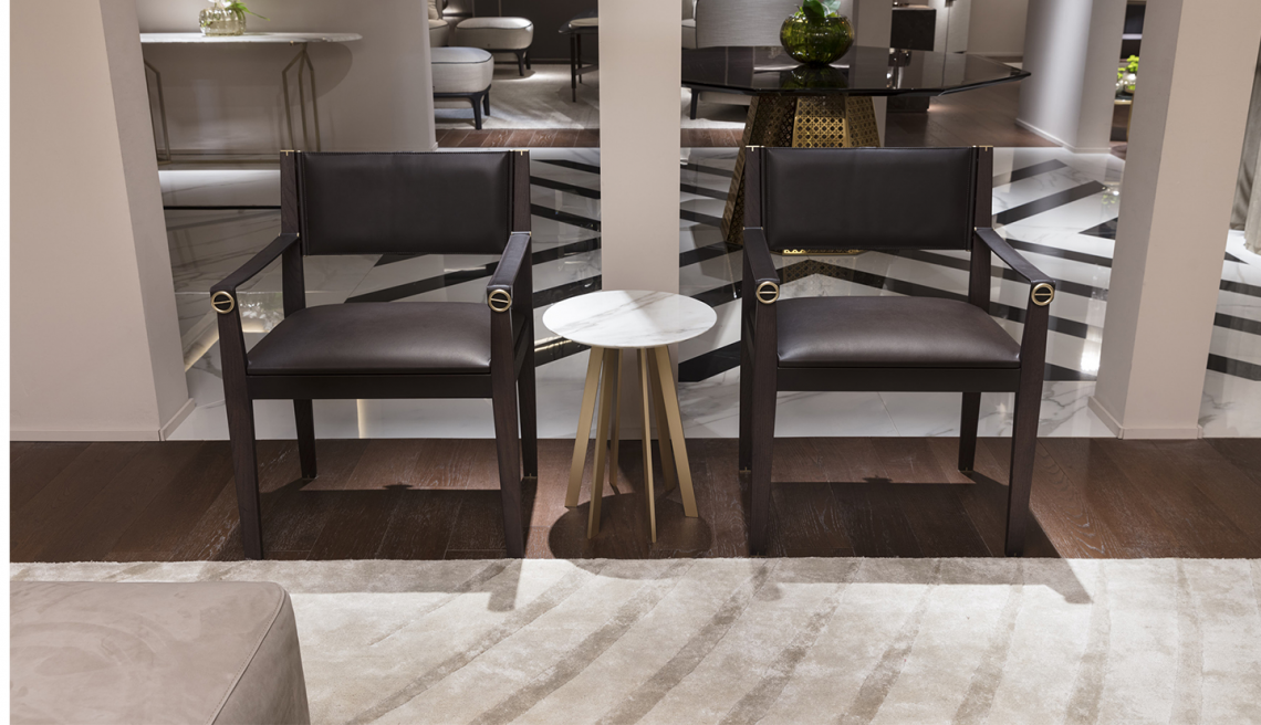 Una sedia polimaterica che profuma di viaggi esotici alla ricerca di un Eden perduto. Ispirata allo stile coloniale lo schienale e la seduta sono rivestiti in cuoio, mentre la ricercatezza della lavorazione della struttura in rovere tinto scuro è esalta dal contrasto cromatico e materico dei preziosi inserti in metallo con finitura oro opaco.