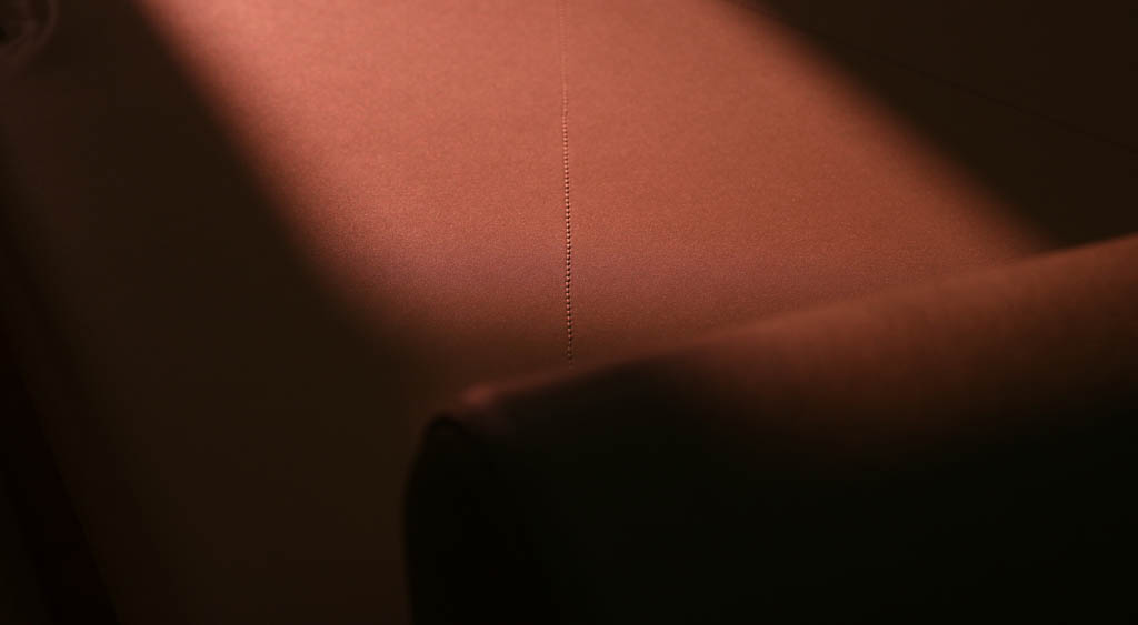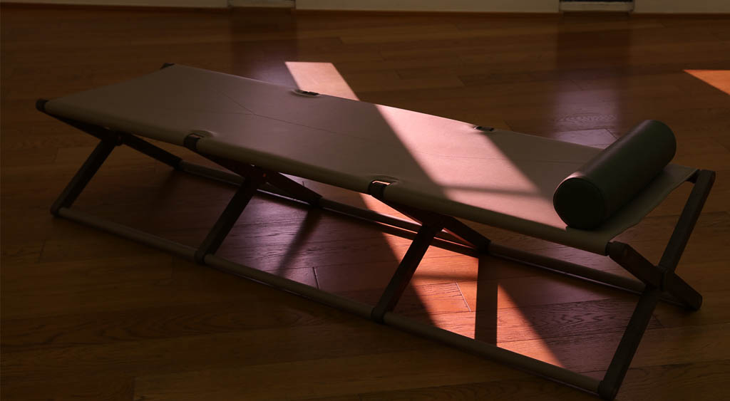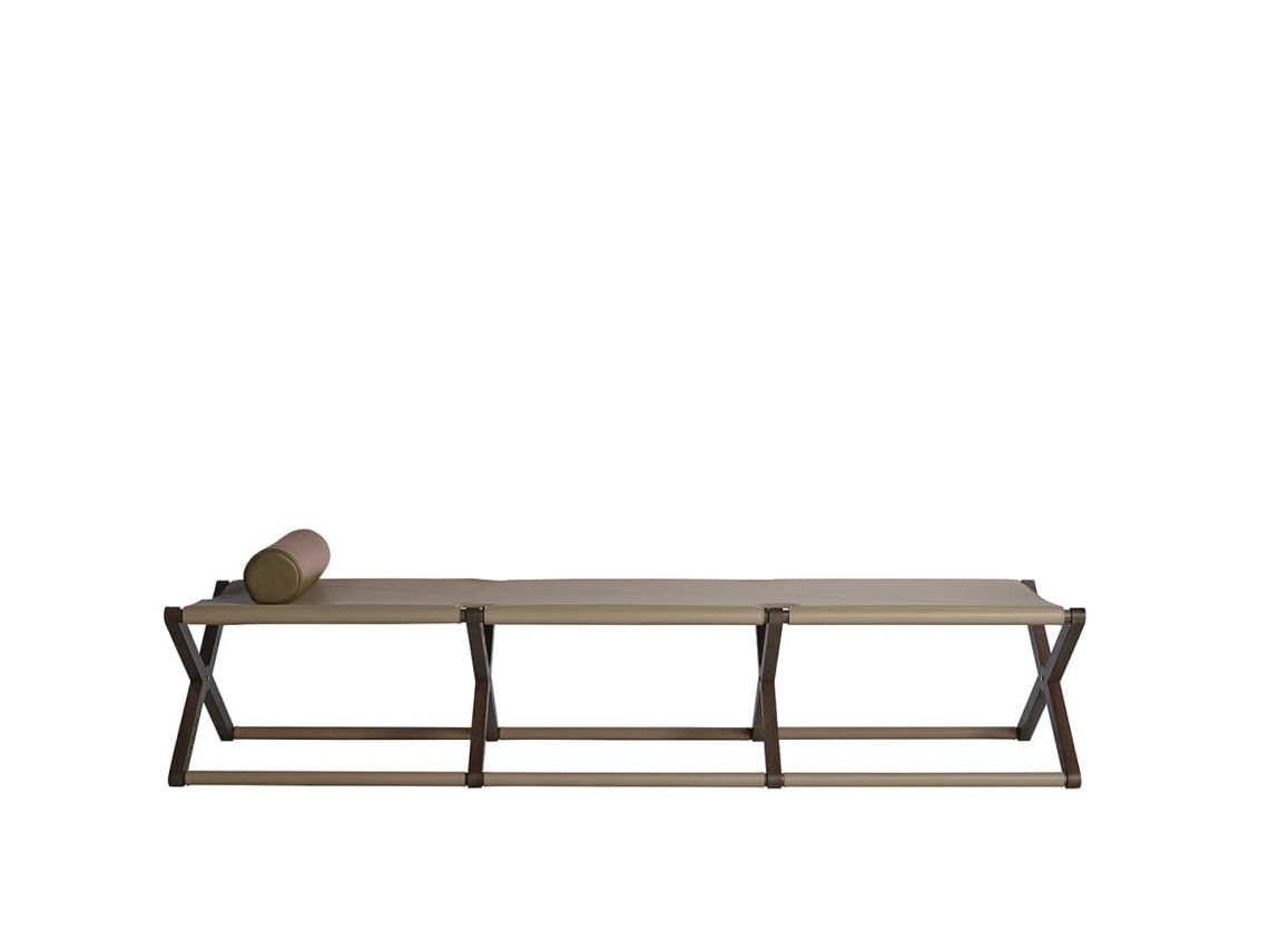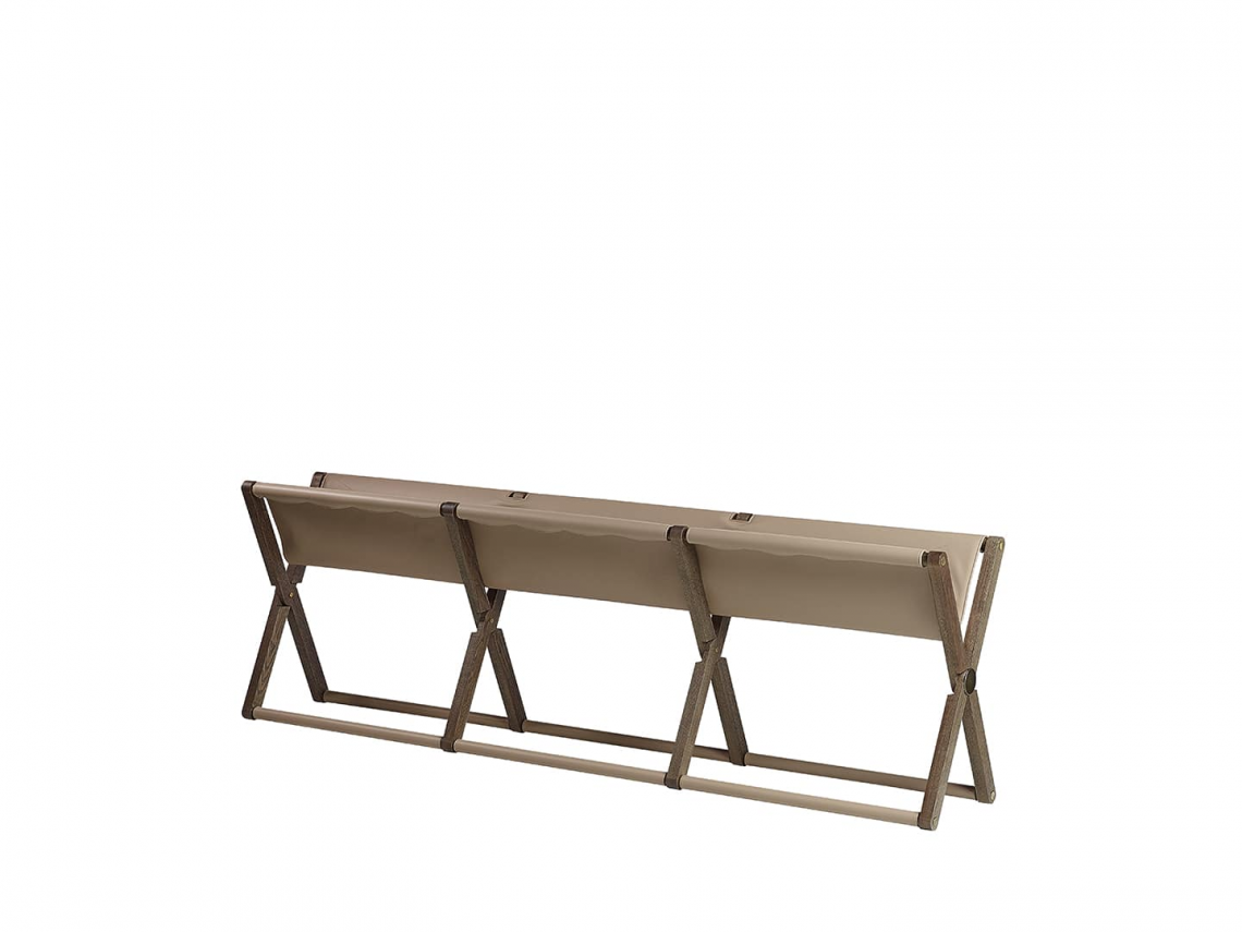 Branda pieghevole con struttura in legno di frassino tinto noce e dettagli in metallo in finitura bronzo ottone opaco, rivestimento in cuoio col. Sabbia e cuciture in tinta.
