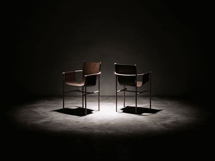 La seduta appare come sospesa, fluttuante, poiché semplicemente calzata nello schienale e infilata nei braccioli.