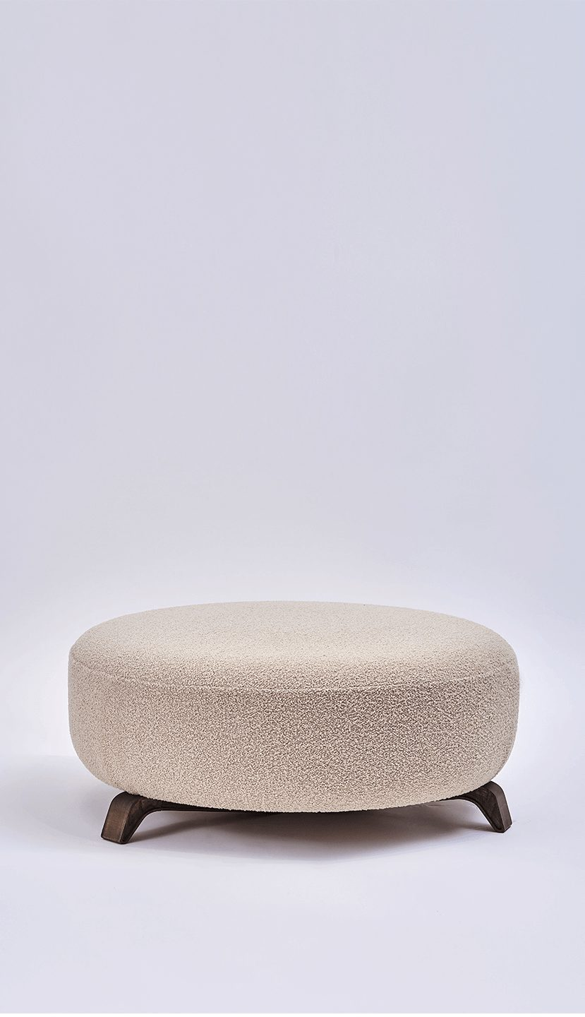 Pouf dalla forma rotondeggiante, poggia su una struttura con gambe realizzate in frassino massello ecosostenibile non selezionato, con finitura acetica, le cui imperfezioni assumono un’evidenza estetica preponderante. Imbottitura realizzata con gomme biologiche, cuffia in ovatta naturale e cinghie in iuta. Rivestimento non sfoderabile.