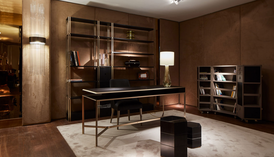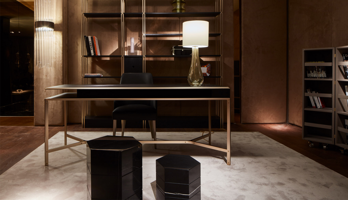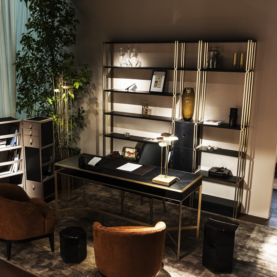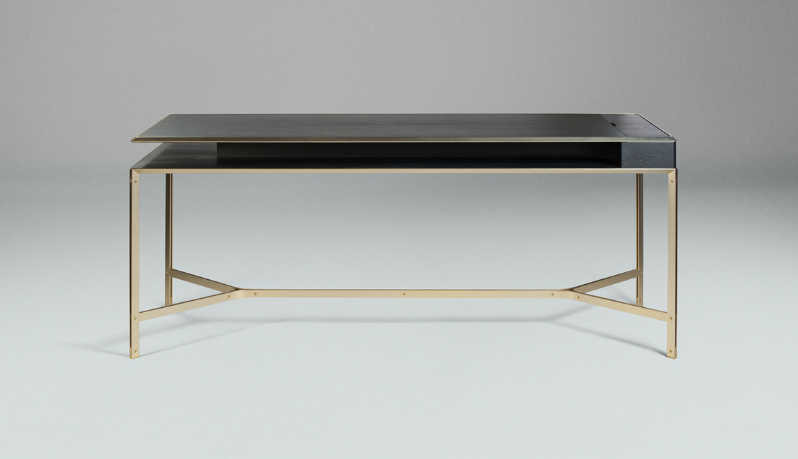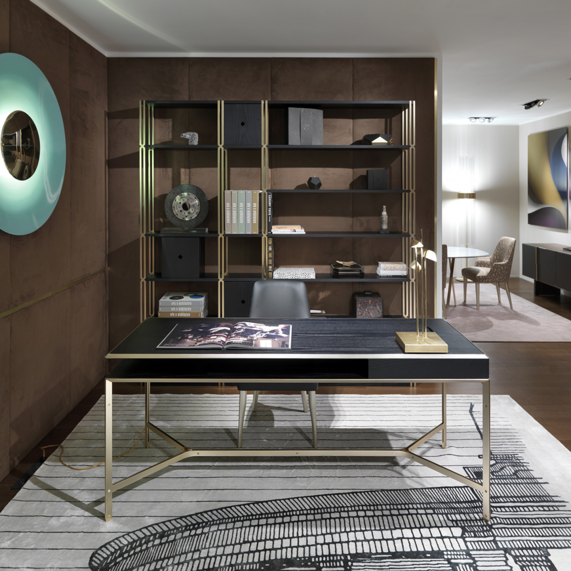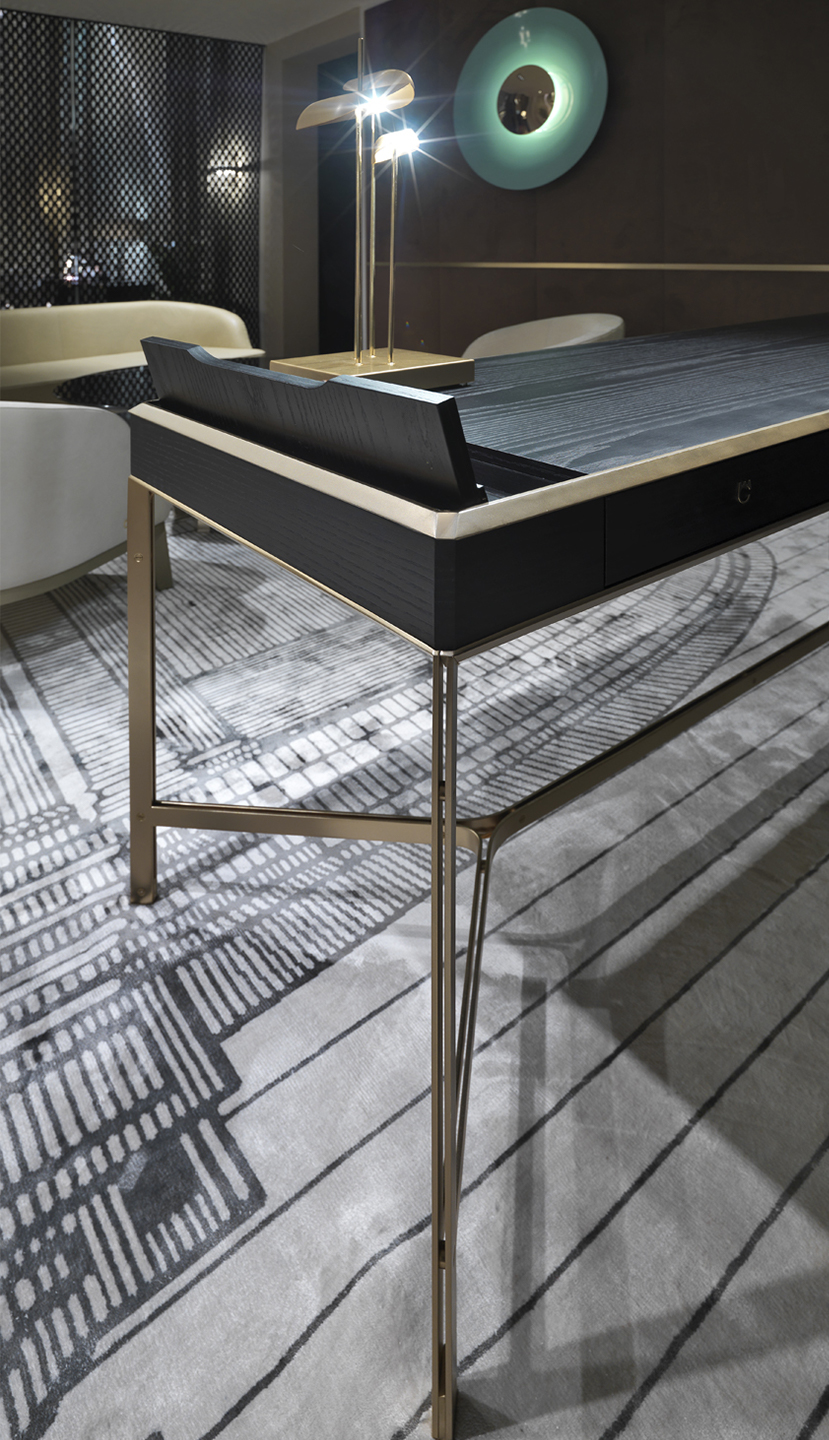 Il cassetto ha apertura push-pull e serratura invisibile. La scrivania è inoltre dotata sul piano di un vano apribile per l’inserimento di apposite prese di corrente
