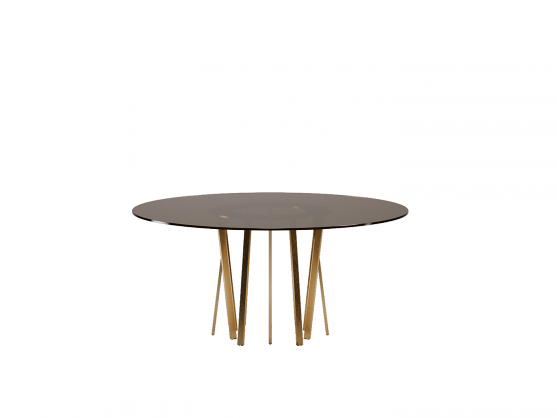sia esso un ingresso o una sala da pranzo. è realizzato con un piano circolare in vetro, disponibile in finitura retrolaccata col grigio marrone Ral 8019, o Amaranto Ral 3007, oppure in vetro trasparente color Avana. La base si compone di 8 gambe in metallo con preziosa finitura oro opaca, disposte con diverse inclinazioni. Spessore piano 1,2 cm.