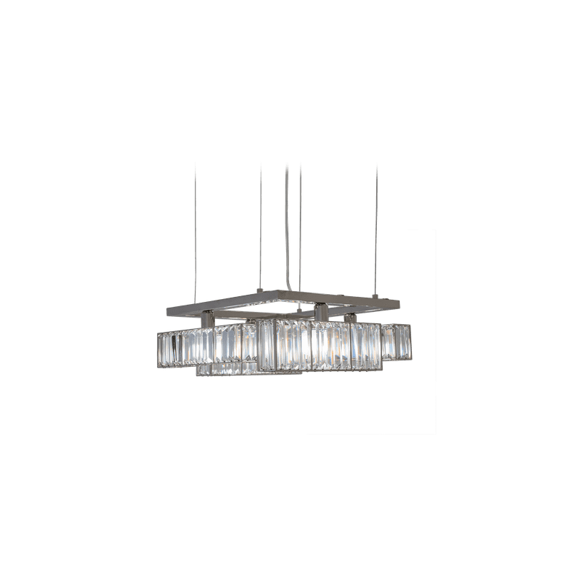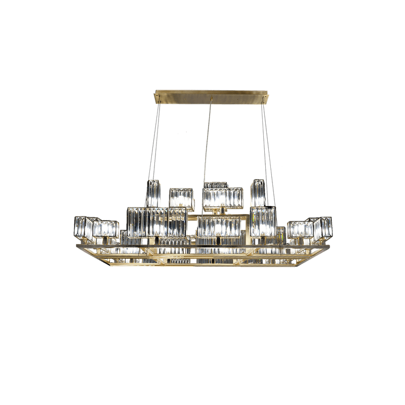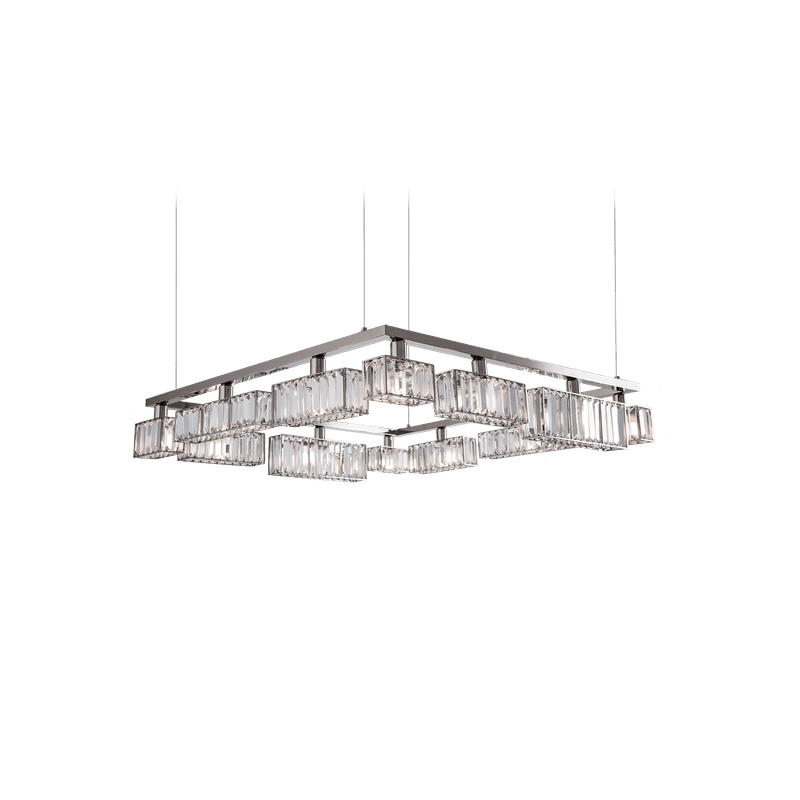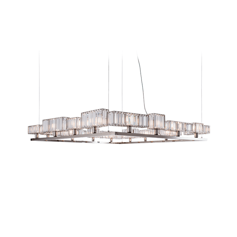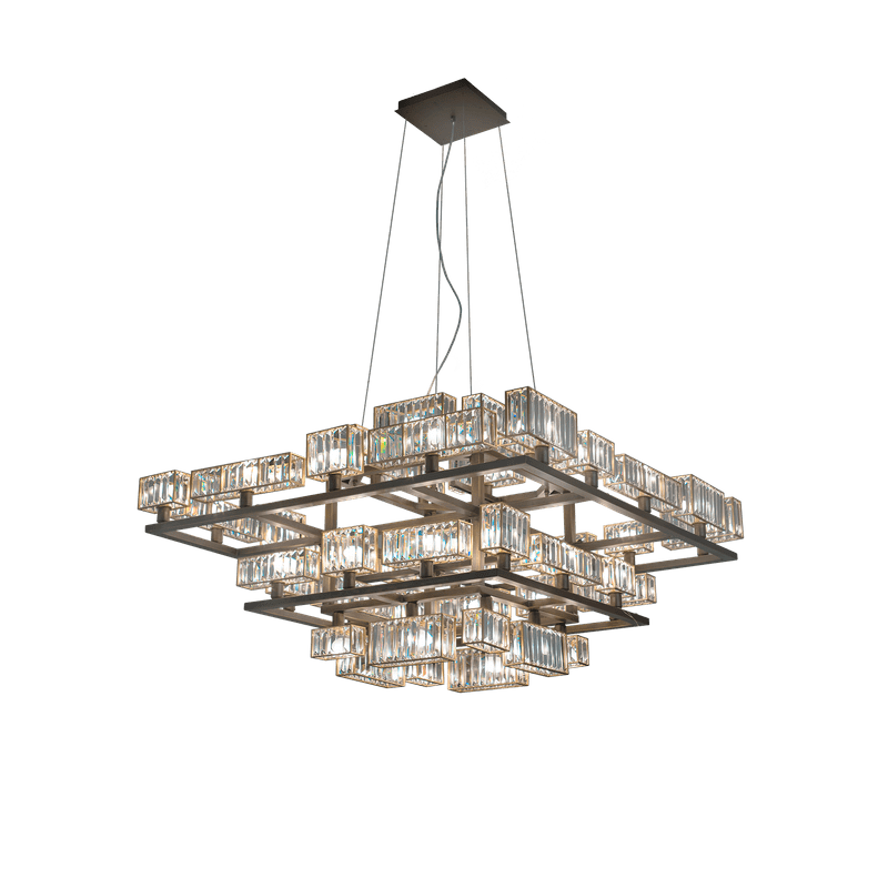 The peculiarity of the collection lies in the high number of possible combinations and the ease in creating new forms and dimensions due to the repetitions of the crystal module: an ensemble of parallelepipeds of various heights made of transparent crystal lozenges, hand-assembled over a metallic chassis.