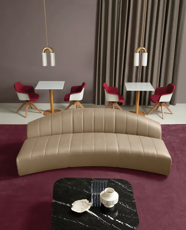 Originale divano monolitico a forma di parentesi.