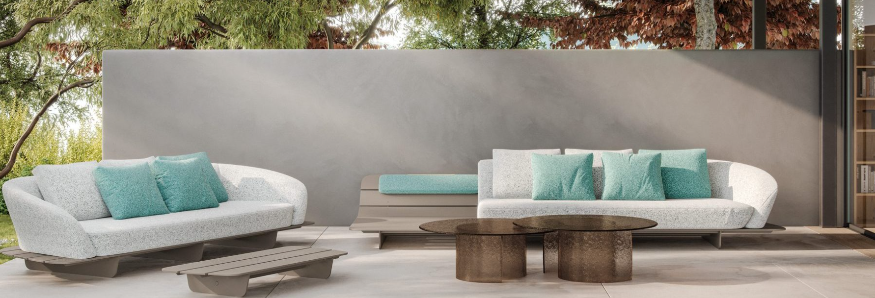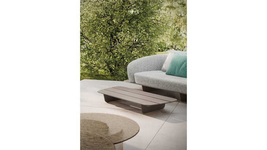 Pouf con struttura a doghe in solid surface. Piedini in tinta. Possibilità di aggiungere cuscini imbottiti in eco-pelle o tessuto outdoor.