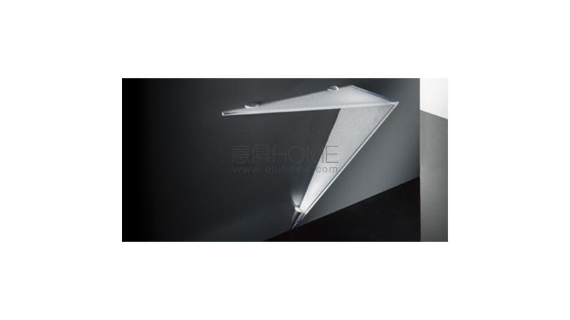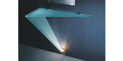 Console in extraclear, bush-hammered glass 15 mm thick with glazed chromed supports to fix to the wall.Available in Right of Left version and with optional lighting system.