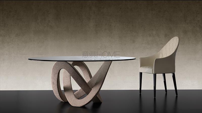 Dining table with base in carved granitic material with bush-hammered finish. Glass top 15mm thick with 45° bevel.