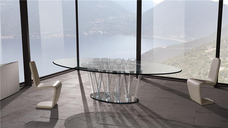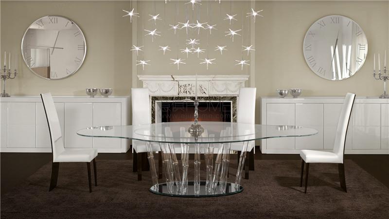 Dining table with base composed by transparent Murano glass tubes with black filigree. Plinth in smoked mirror glass. Extra–clear glass top 15 mm thick