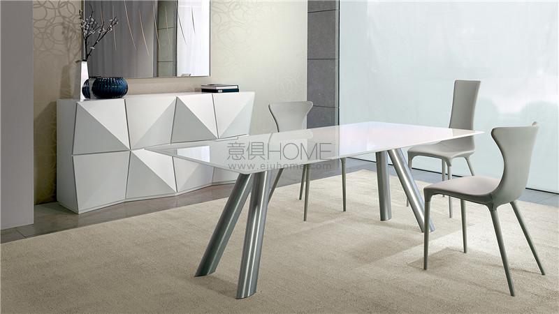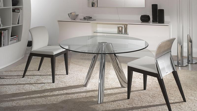 Dining table with base composed by oval section legs in brushed aluminum, shiny chrome, shiny black nickel or in satin brass or titanium finish. Top available in transparent, lacquered or etched lacquered glass or in Marble glass