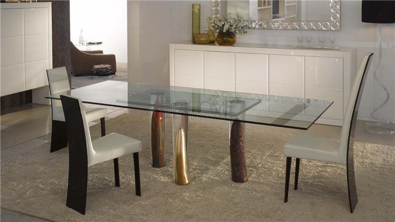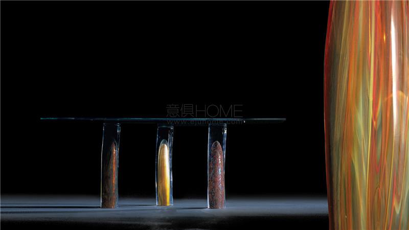 Dining table with base composed by Murano glass columns in Oro,  Murrine and Striato finishing. Lower top 24 mm thick and upper glass top 15 mm thick. Limited production with numbered pieces.