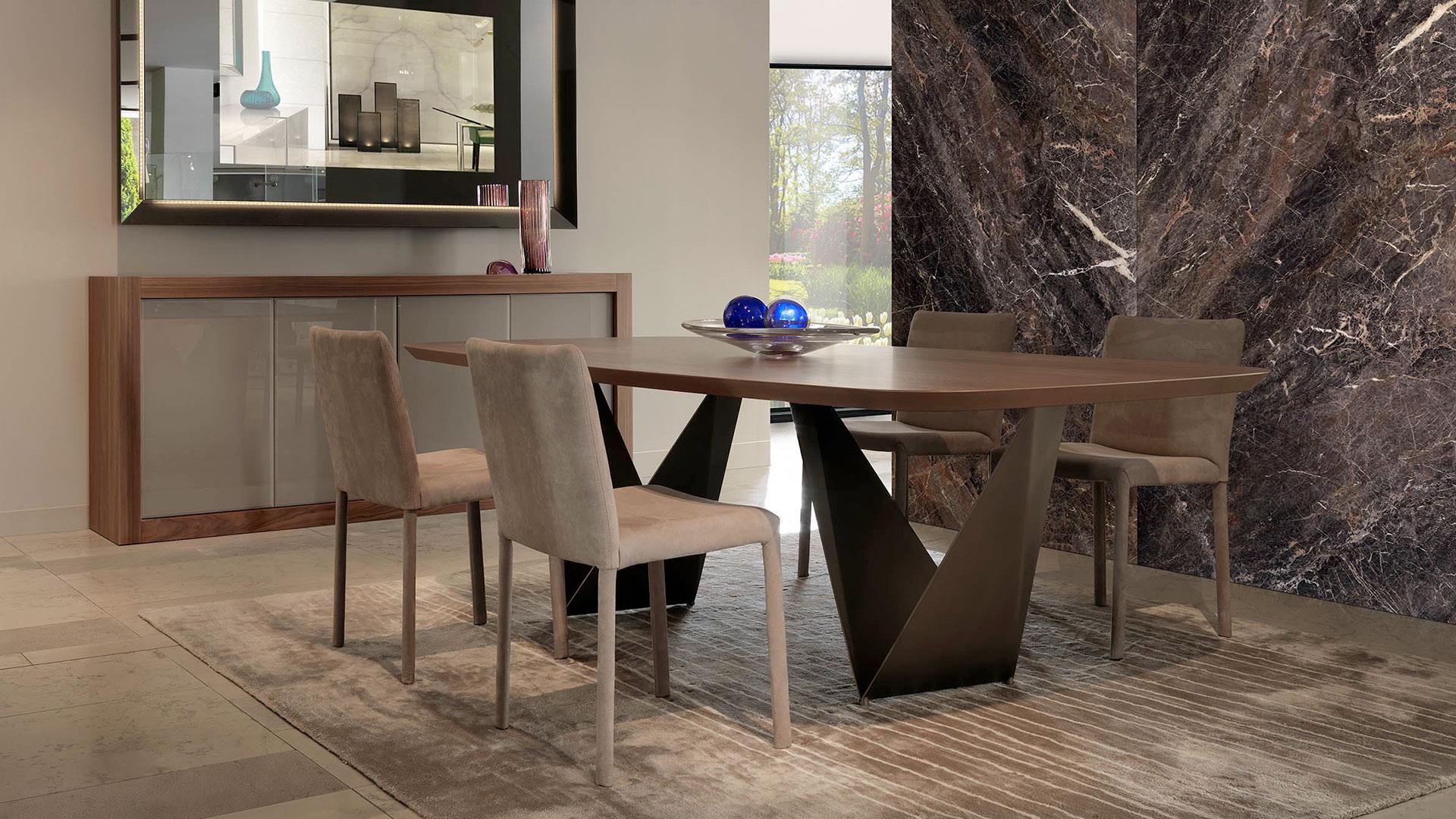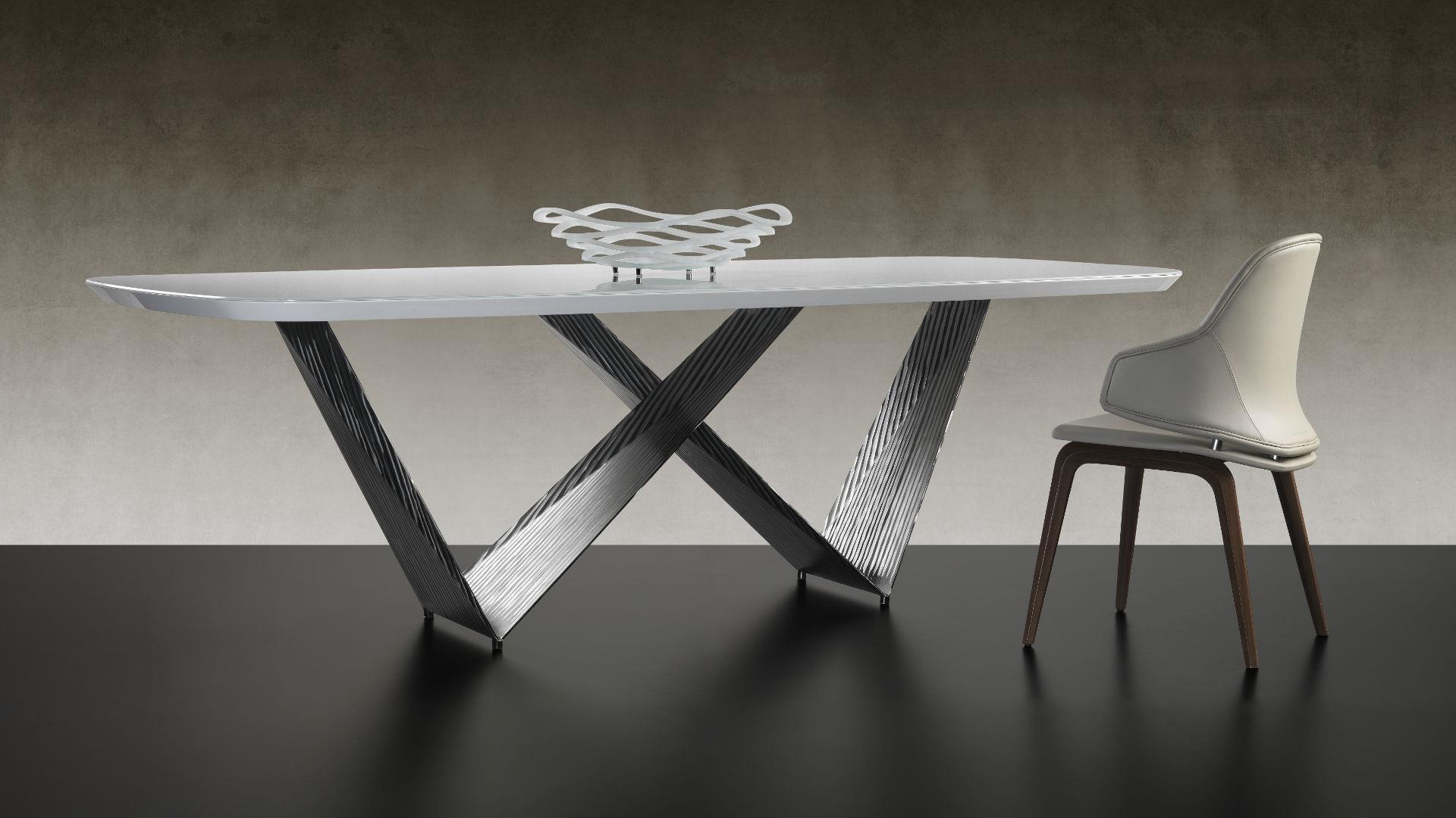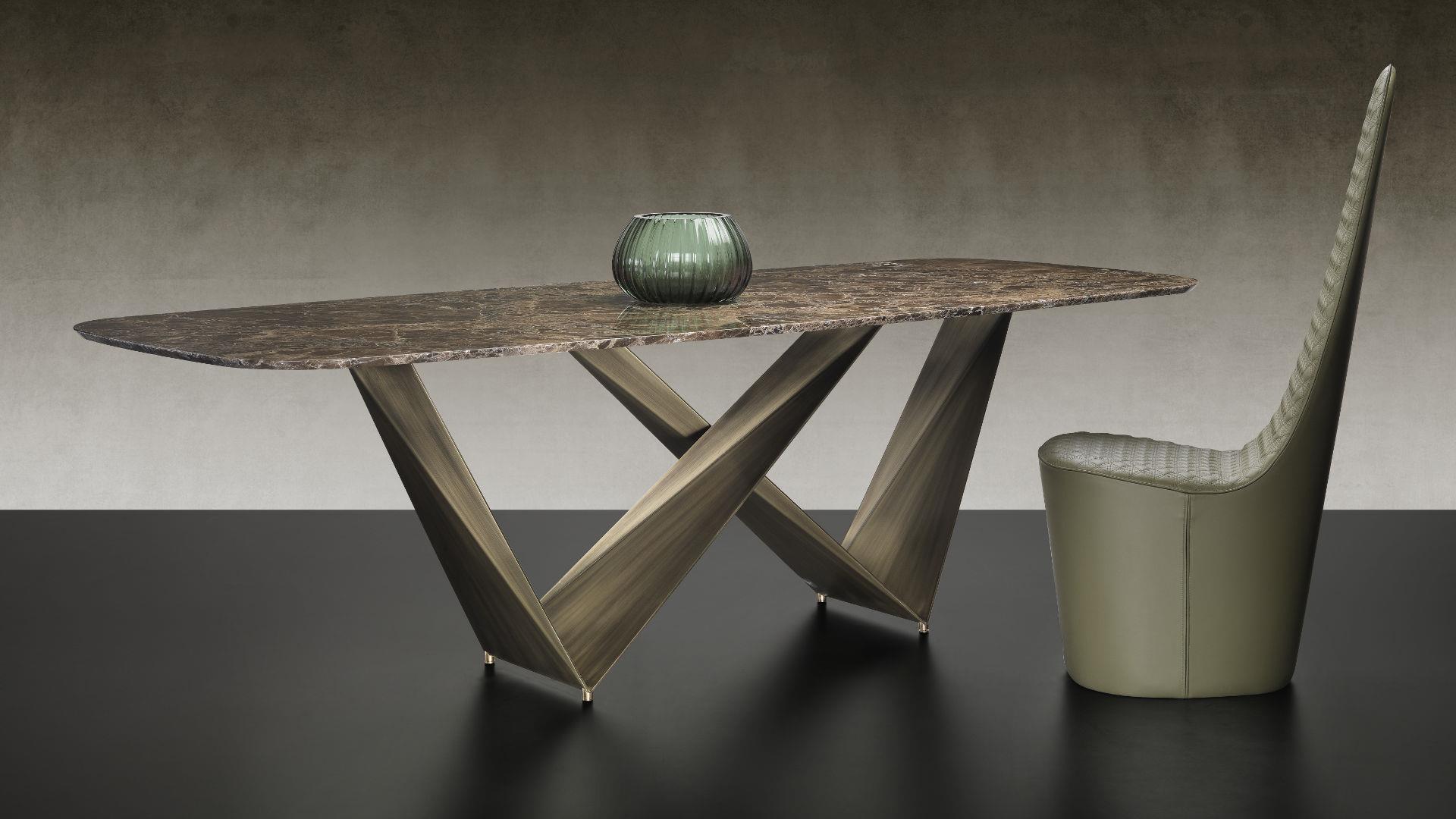 Dining table. Metal bases in Grafite, scratchy steel or in satin brass or titanium finishing. Top in tempered 15mm thick transparent glass.