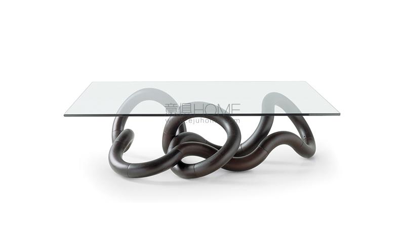 Coffee table with base made of curved elements in wenge finish, satin brass or dark brass, shiny copper or shiny black nickel finish. Glass top 12 mm thick.