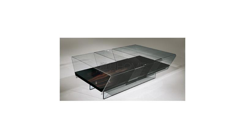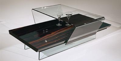 Coffee table with wooden top in white or black shiny lacquered finish or in shiny ebony wood or in Canaletto walnut.Sliding top in curved 10mm thick glass and glass legs 15 mm thick.