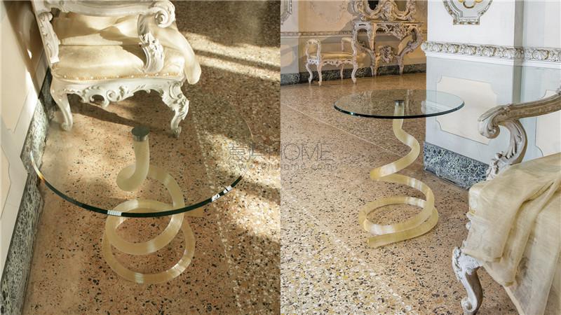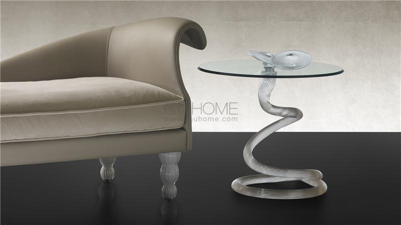 Side table with base in ribbed Murano glass: transparent, black, amethyst, tea or gold. Glass top 10 mm th. with 45° bevel.