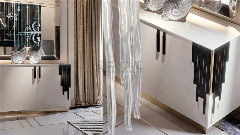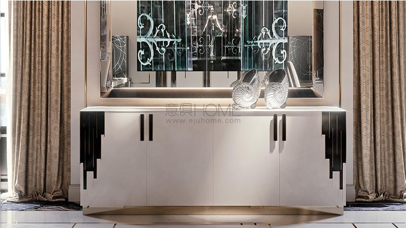 Buffet with wooden structure shiny lacquered finish. Top in lacquered glass and shaped decorations in shiny lacquered wood with details in glazed-gold metal. Plinth in brass finish. 4 doors with metal handles in glazed gold finish and glass detail.