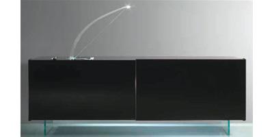 Sideboard with 2 sliding doors covered in lacquered or etched lacquered glass. Optional legs in transparent glass or in brass or titanium finished metal.