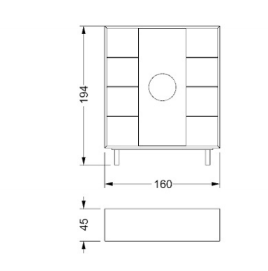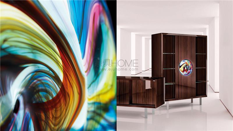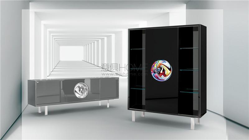 Cupboard in shiny ebony wood or in shiny lacquered finish with sliding central door with coloured Murano glass disc and lighting system. Side open compartments with glass shelves. Steel base.