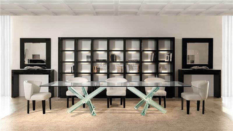 Modular bookcase in shiny lacquered wood with applications in bevelled lacquered glass on the fronts, or in shiny ebony wood. Backs available in white lacquered glass, Antique mirror or in Marble glass. Optional lighting system.