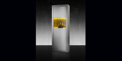 Sideboard with wooden structure covered in smoked mirror glass. Storage unit with folding door in smoked mirror glass with Diamante engravings. LED lighting system.