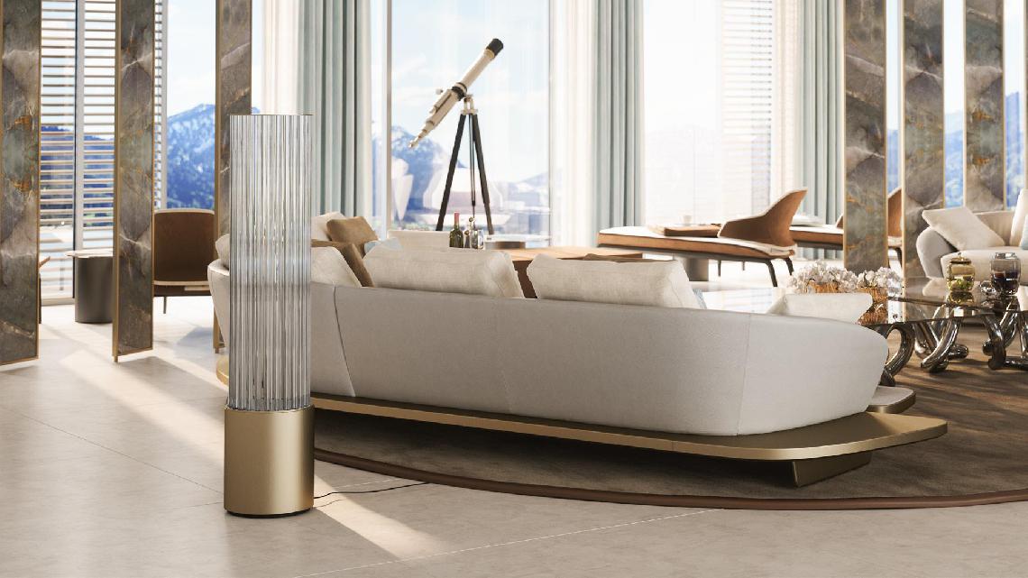 Lampada da terra con struttura in metallo finitura Bronze, Ottone, Ottone dark, Titanium ed elementi in cristallo trasparente.Luce LED
