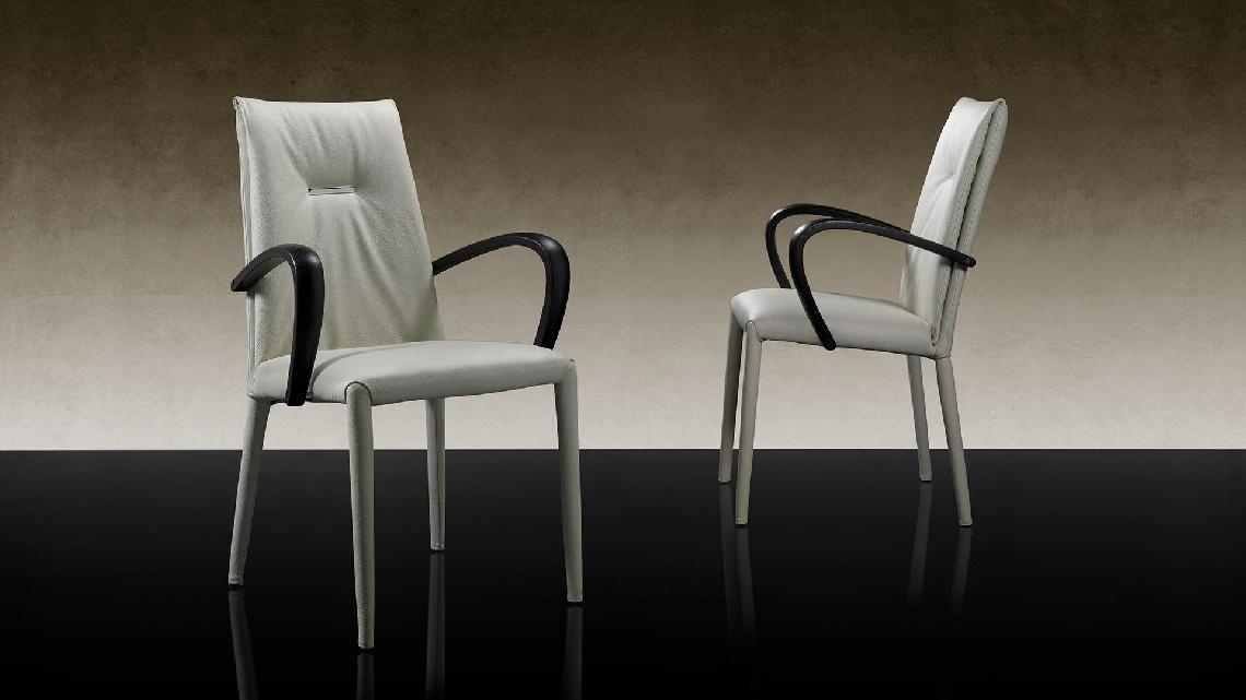 Chair with internal metal structure and upholstery in leather, velvet or fabric with shiny steel detail on the back.