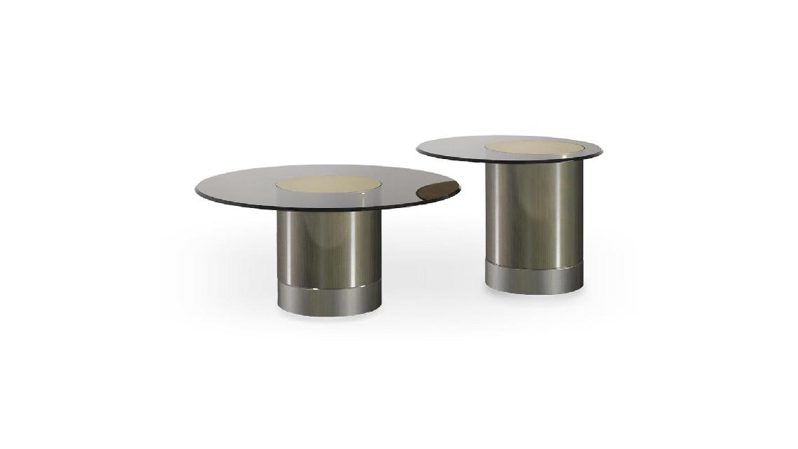 Collection of low and side table with cylinder base painted in shiny dark brass finish with a bottom section in satin matt brass. Junction plate in shiny steel. Top in 10mm thick bronze glass with 45° bevel, placed at the centre or cantilevered.