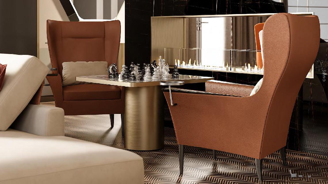 Bergère with structure in wood and rigid polyurethane. Seat cushion with feather padding and polyurethane insert. Upholstery in fabric or in leather. Wooden legs in satin brass or titanium finish and optional glass-holder.