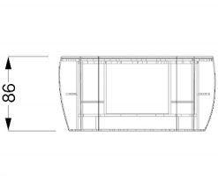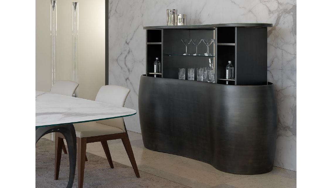 Shaped sideboard/bar cabinet in matt lacquered finish or in satin brass or titanium finishes. Top in Marble glass. Electrical lifting system with remote-control to pull out the internal storage unit equipped with glass shelves and bottle-holders.