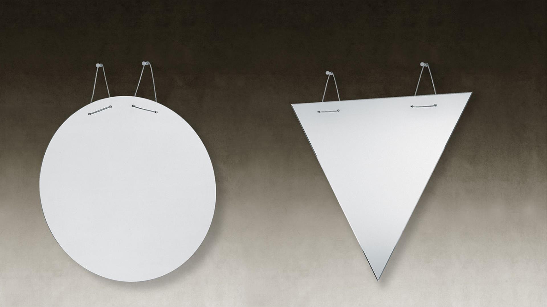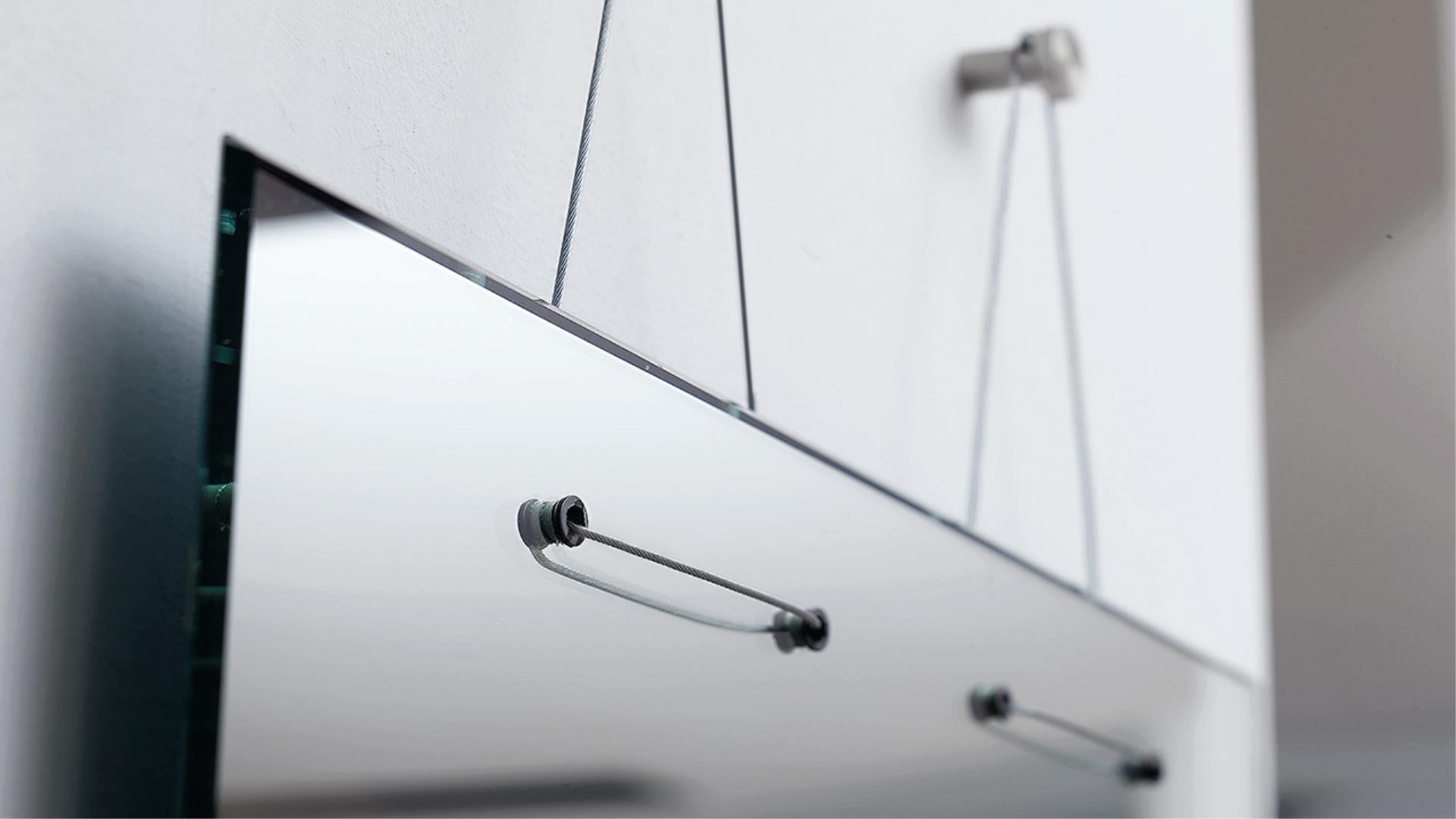 Mirror 5 mm thick with 45° bevel with hanging steel cables and supports.