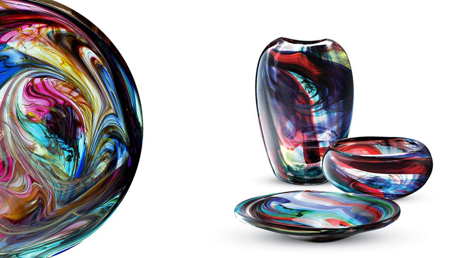 Coloured Murano glass vases and plate in 'Striato' finish.