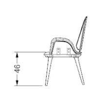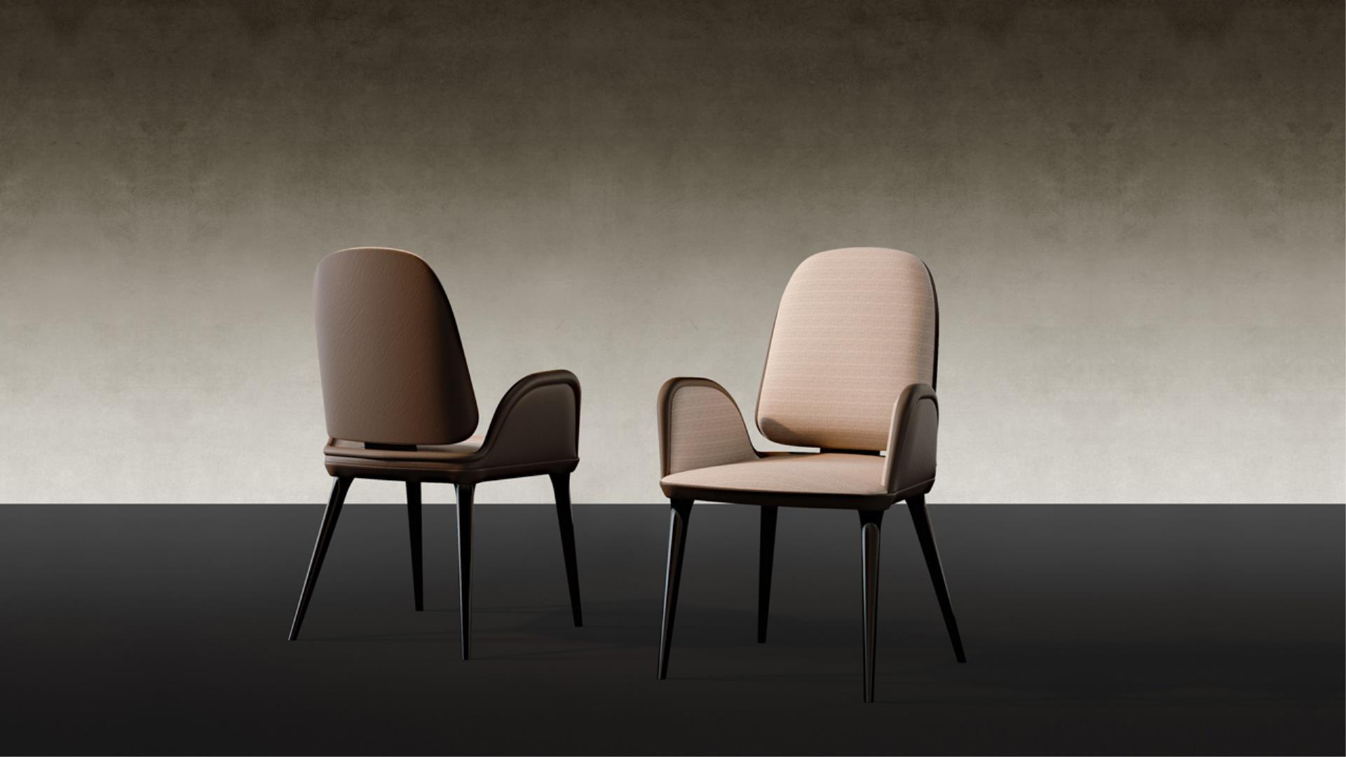 Chair with padded wooden structure. Upholstery available in fabric or leather.Wooden legs in oakwood Beluga or in satin dark brass finish.Profile of the armrests in satin dark brass.