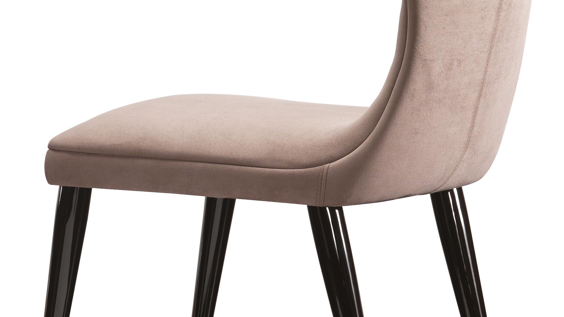 Chair with foamed structure. Available with wooden legs in nero beluga shiny lacquered finish or with metal base with chromed or satin brass finish. Upholstery in fabric, velvet or in leather.