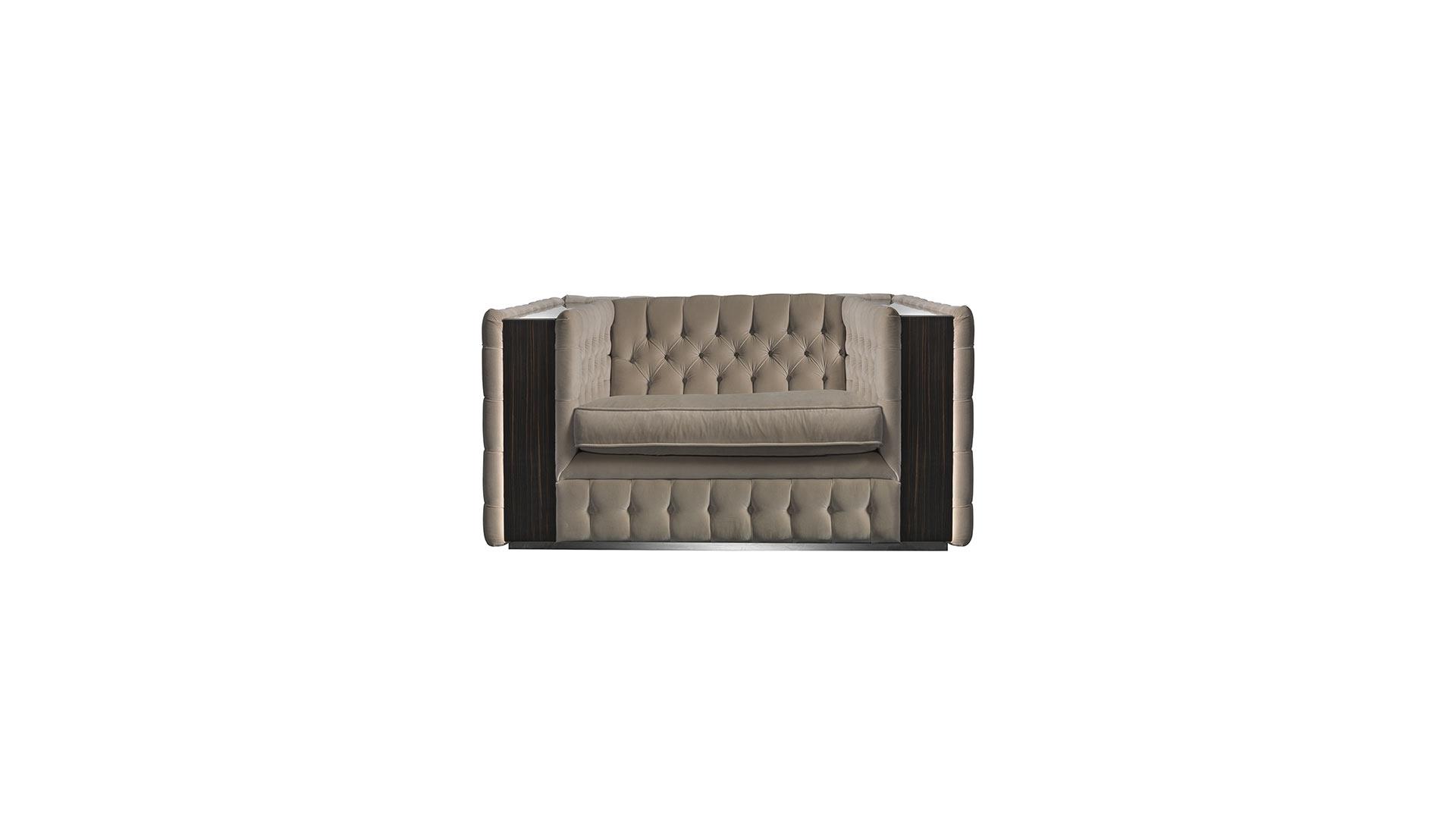 Poltrona con telaio in legno ed imbottitura in piuma con inserto in poliuretano.