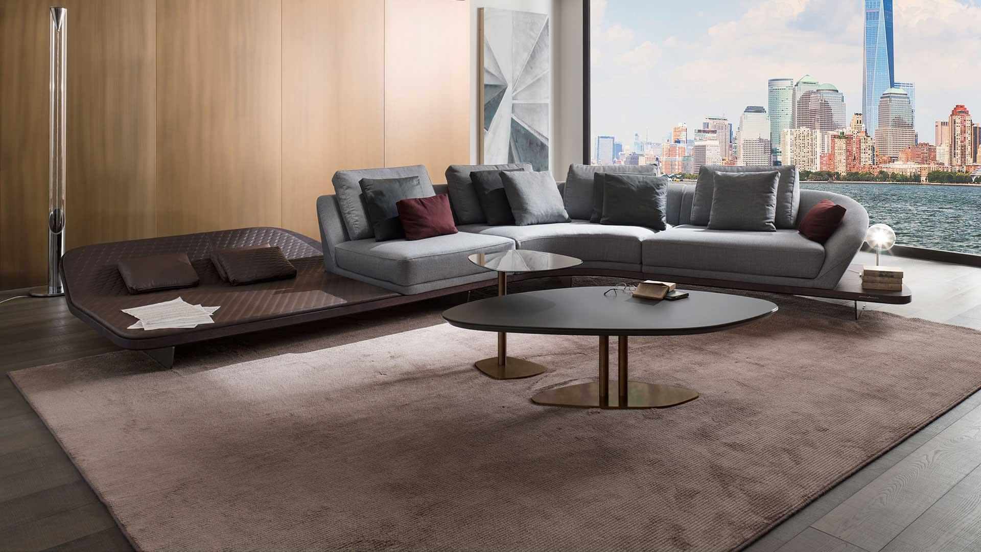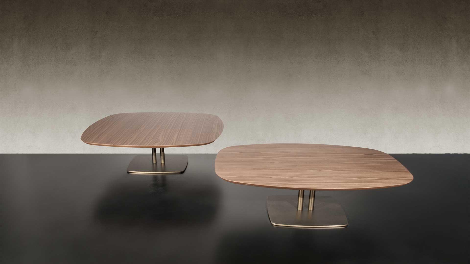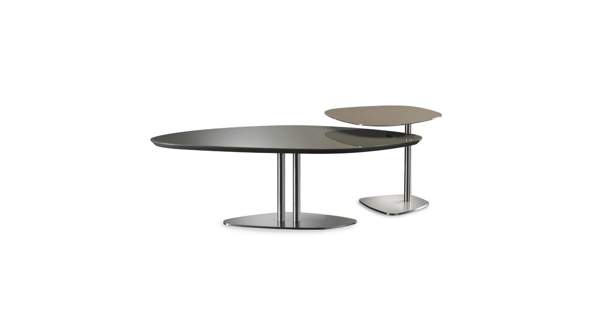Collection of low and side tables with shaped top and metal base in various heights. Top in 10mm thick glass lacquered, etched lacquered, Mesh glass or Marble glass. Top also available in 25mm thick Bevel Wood in Canaletto walnut, Henné or Miele oakwood, matt lacquered covered with lacquered or etched lacquered glass or in satin brass or titanium finish.