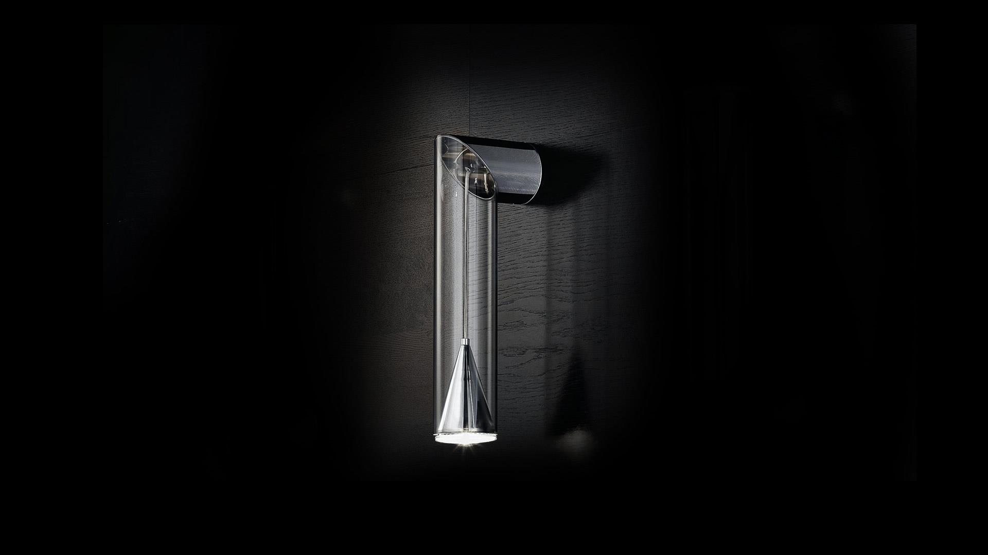Wall lamp in transparent borosilicate glass with chromed support. LED system