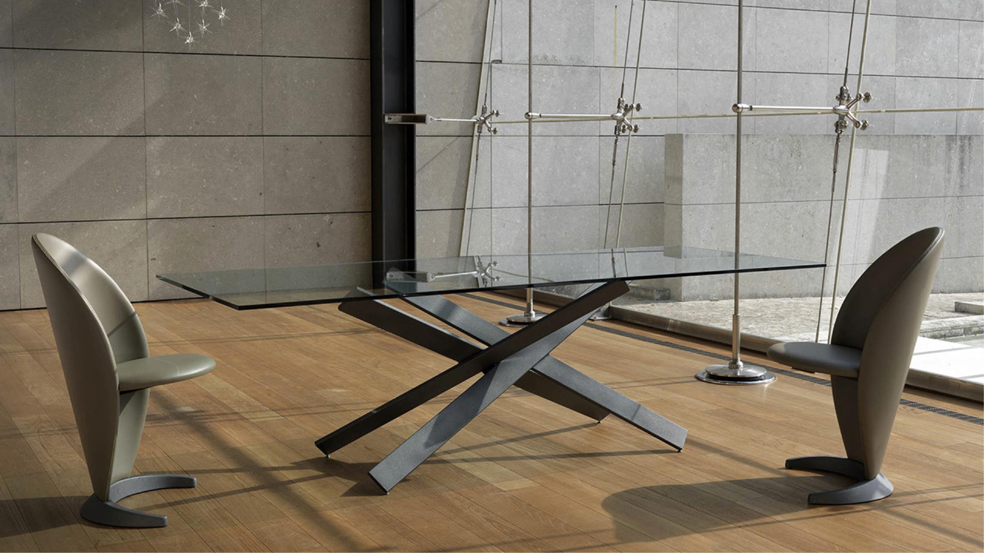ining table with iron base available in Grafite or in satin brass or titanium finishing.Top available in glass, extraclear glass, smoked glass or in Marble glass
