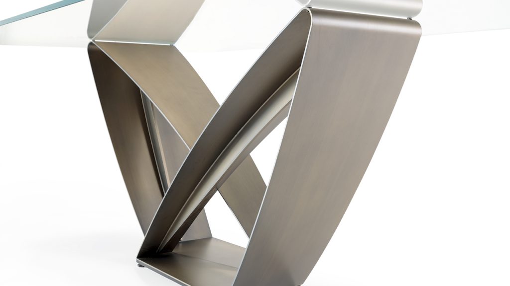 Tavolo pranzo con base in ferro finitura Bronze (100M). Piano in vetro, vetro extrachiaro, vetro fumè, MarmoReflex o LegnoReflex. Piano Bevel Wood in Noce Canaletto o in Canaletto Henné. Piano Bevel Wood Bronze (100M) con cover in Marmoreflex/Legnoreflex.Base disponibile anche in finitura ottone (104M), ottone dark (105M), titanium (101M).