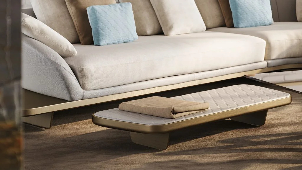 Pouf con piano in Rovere Henné, Miele, Beluga, Noce Canaletto, finitura satinata ottone (104M), ottone dark (105M), titanium (101M).
