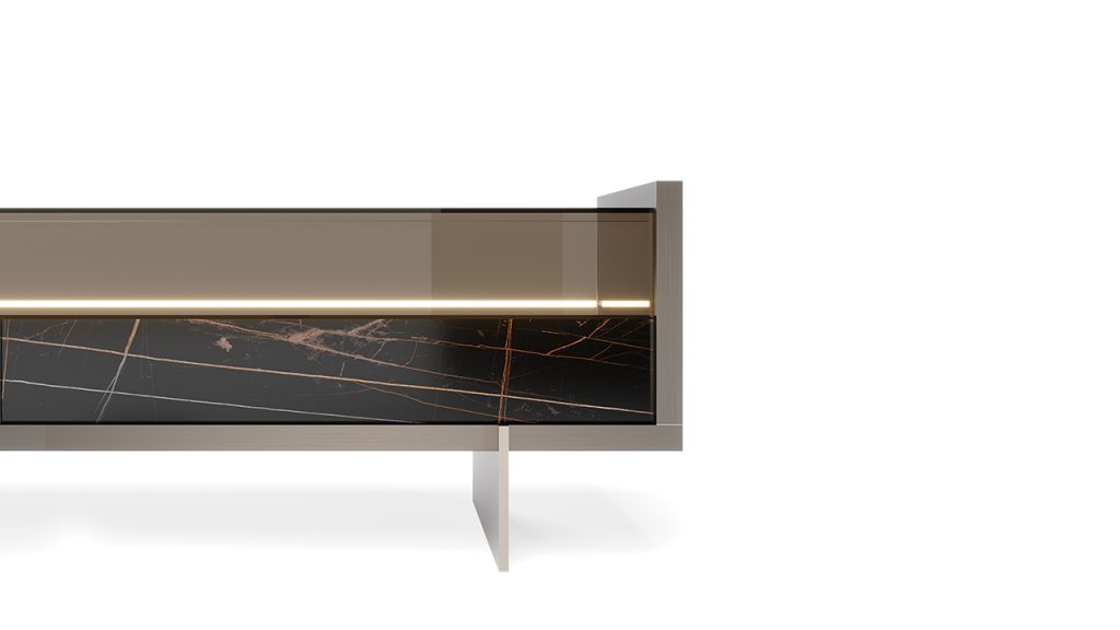 Ante e cassetti in MarmoReflex o LegnoReflex. Vano a giorno in Vetro Bronzo con vetro a specchio bronzo o in Vetro Fumè con vetro a specchio fumè.