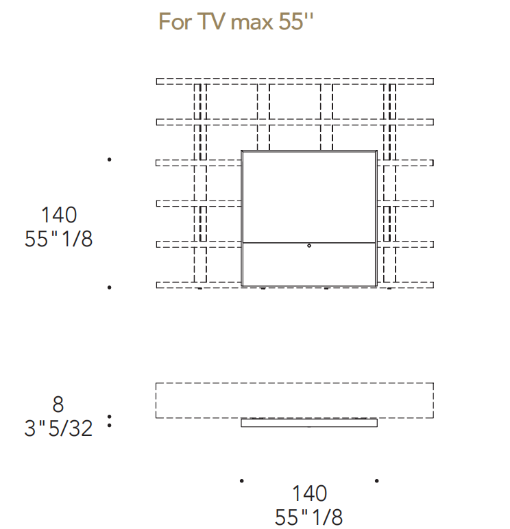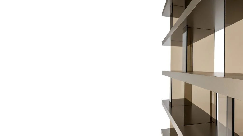 Libreria modulare a incastro con divisori in vetro fumé o vetro bronzo sp. 10mm e ripiani in legno in finitura Bronze o in finitura metallica satinata. Anta scorrevole porta TV in vetro Dark Grey. Cornice in metallo in bronze (100M). Fascia per speaker in lycra nera