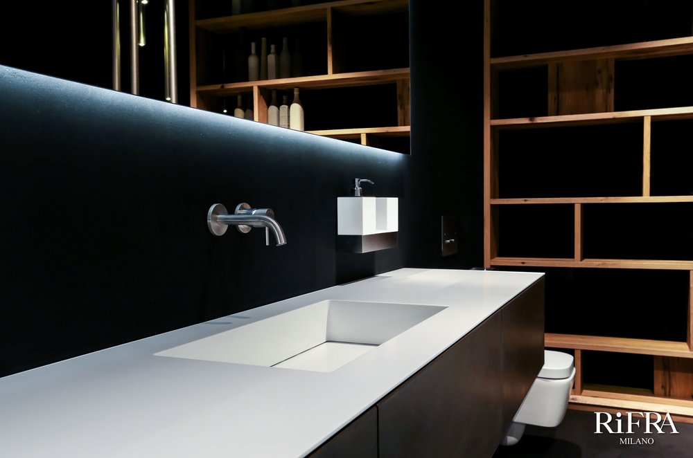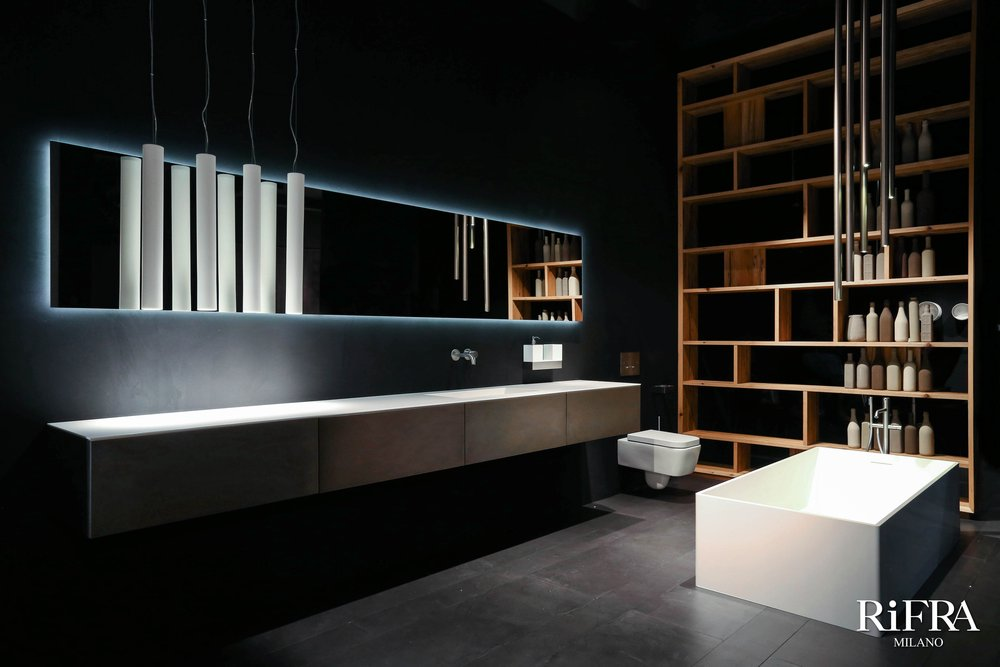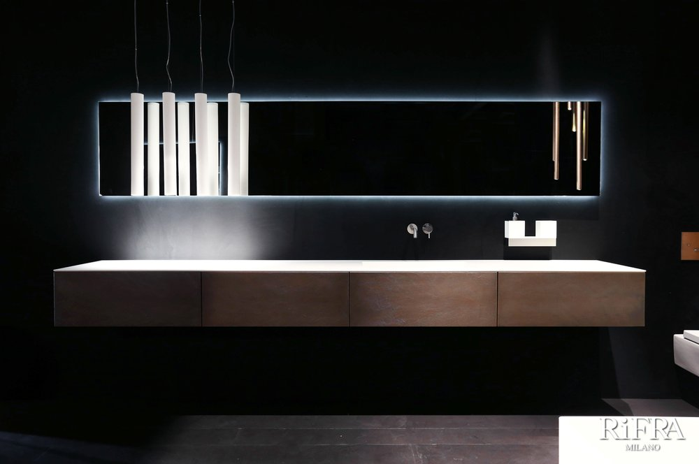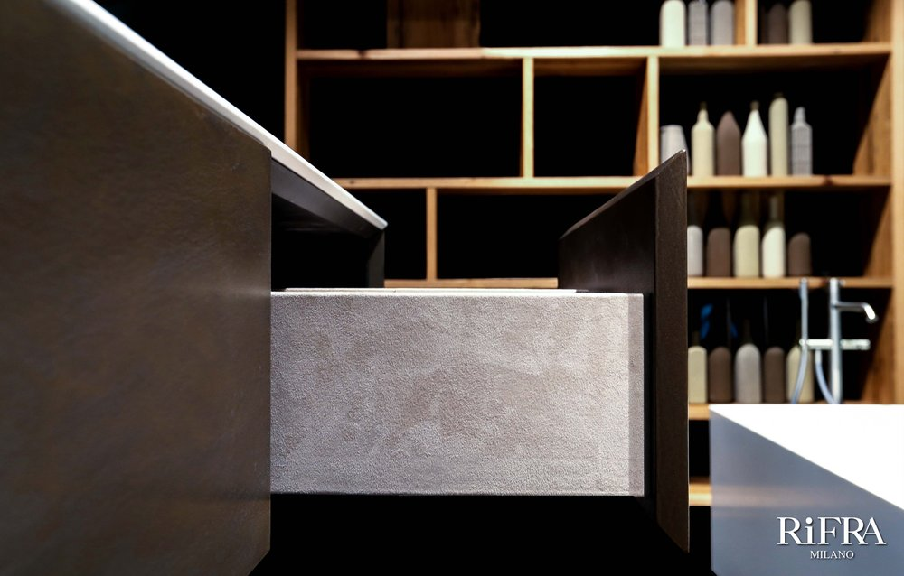 Finitura mobili isola e quinte: cemento nero spatolato a mano.