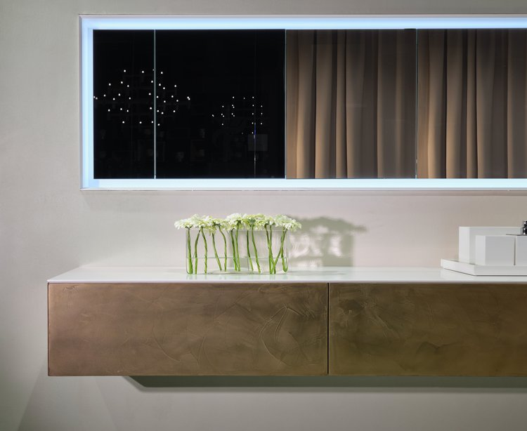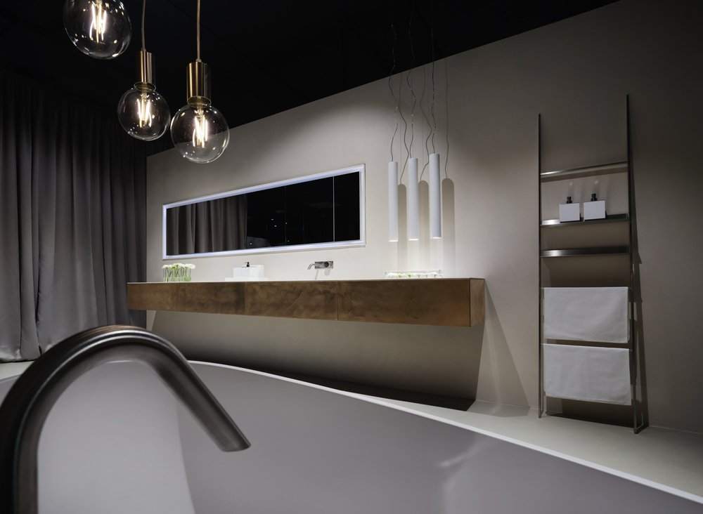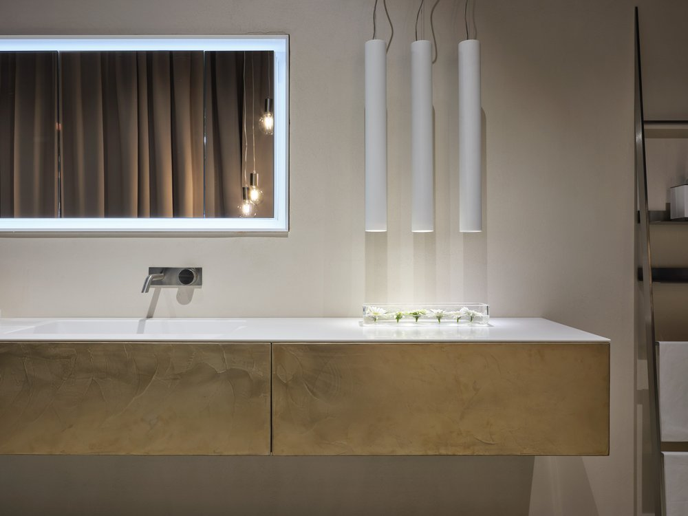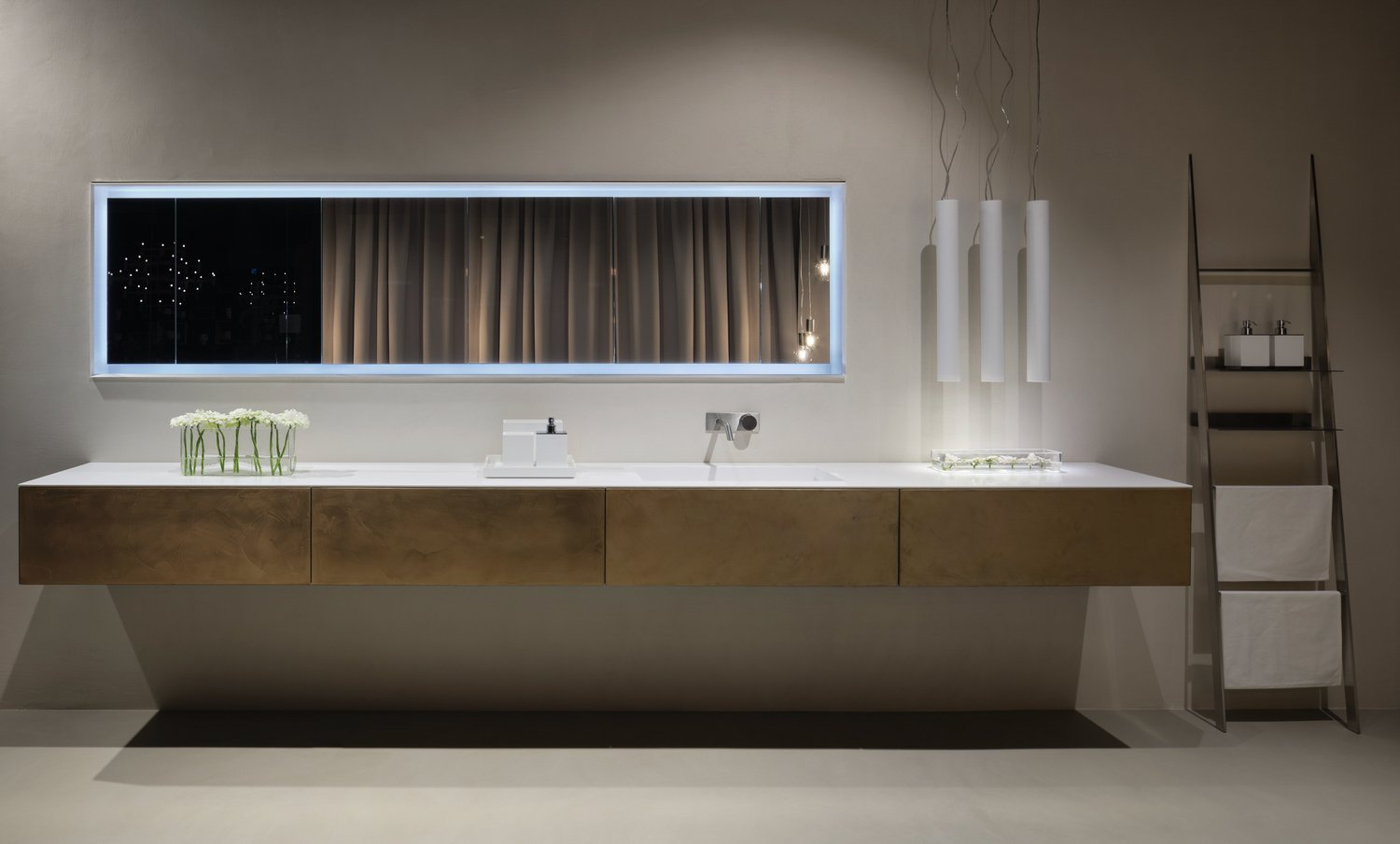 Finitura mobili isola e quinte: cemento nero spatolato a mano.