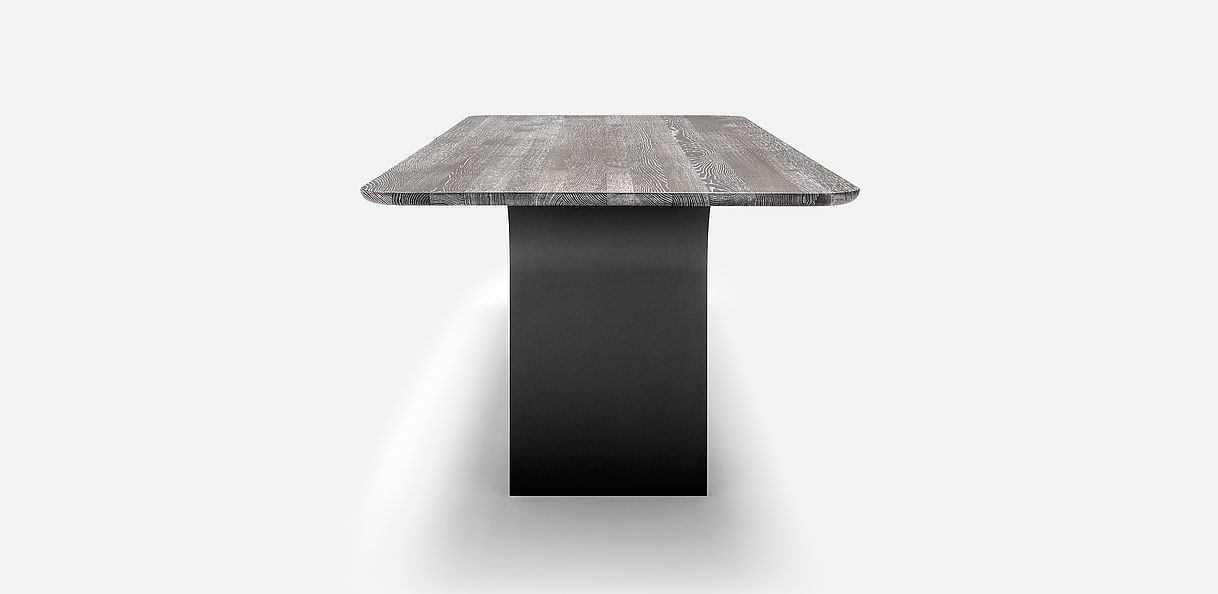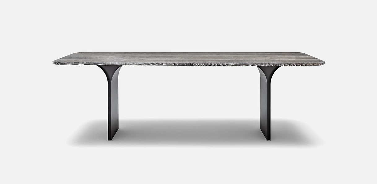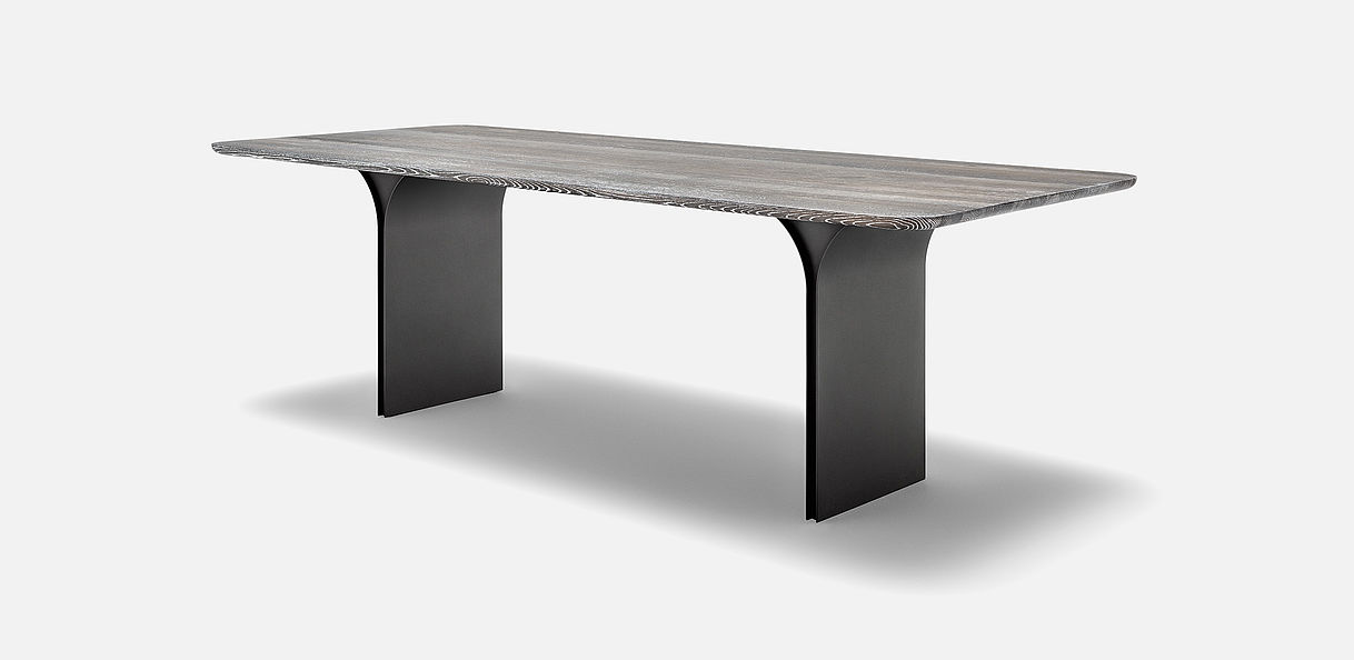 The Rolf Benz 990 dining table gives pure elegance a modern look that you can combine in any way you like. Clear and delicate – Rolf Benz 990 brings both these properties to the table. The brushed, stained or optionally limed oak table top with a distinctive feel seems to float on narrow, powder-coated panels in Black or Umbra grey. These open up like a flower towards the table top. Soft radii along the edges form an exciting contrast with the solid weightiness of the oak wood. They taper from the table top to the underside and feel extremely pleasant to the touch.